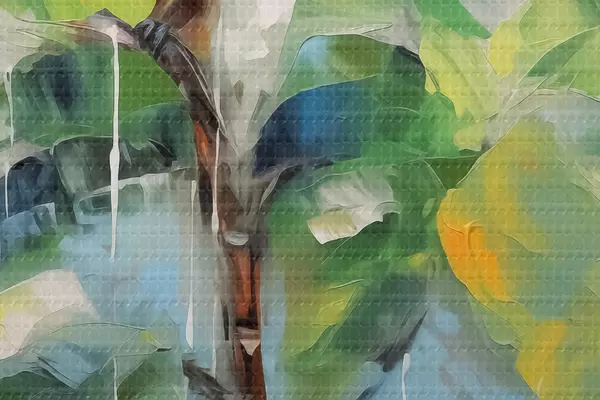 Kép Absztrakt tukán ül a banán pálma, zöld, kék, szürke, sárga, piros színű Nr r40518
