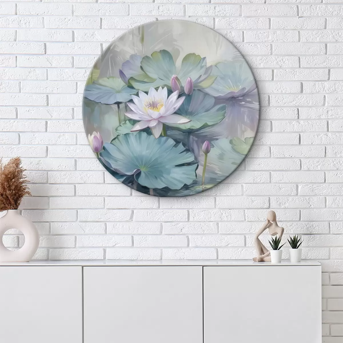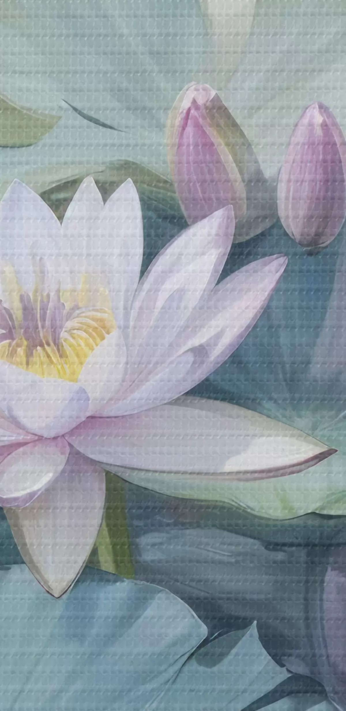 Kép Nyugodt kép egy tóról, tavirózsákkal és virágokkal pasztell színekben, körülvéve buja zöld tavirózsa levelekkel Nr r40542