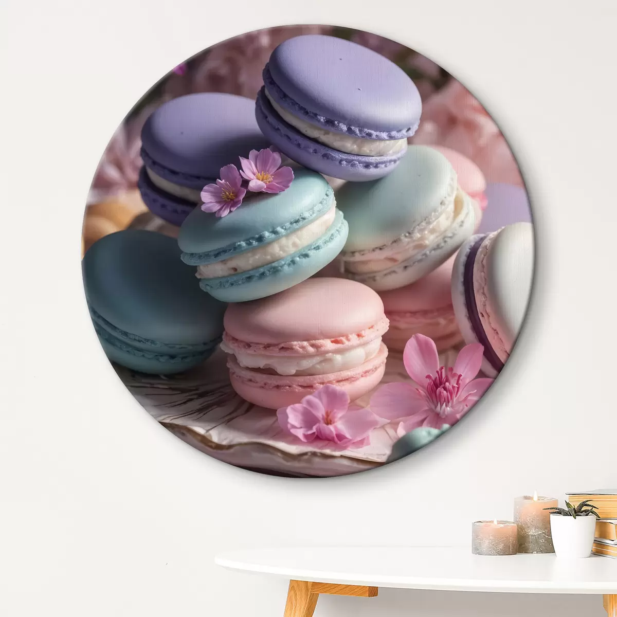 Kép Színes makarónik rózsaszín és lila virágokkal egy tányéron, közelkép Nr r40546