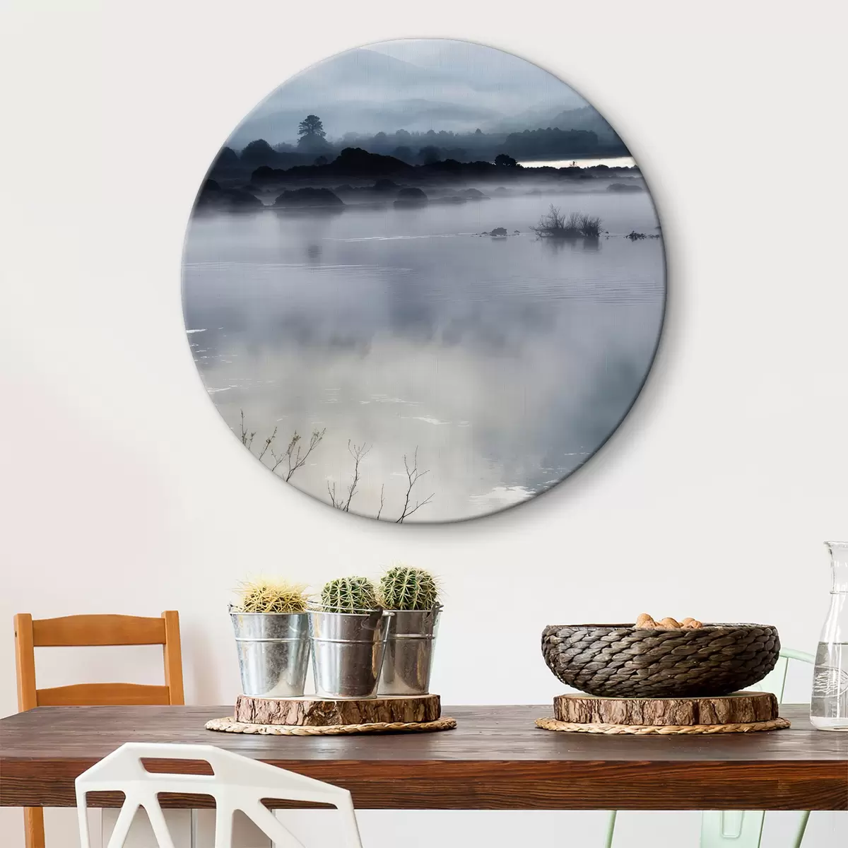Kép Ködös tó, a háttérben dombok és fák sziluettjeivel körülvéve, nyugodt, tükröződő felülettel Nr r40552