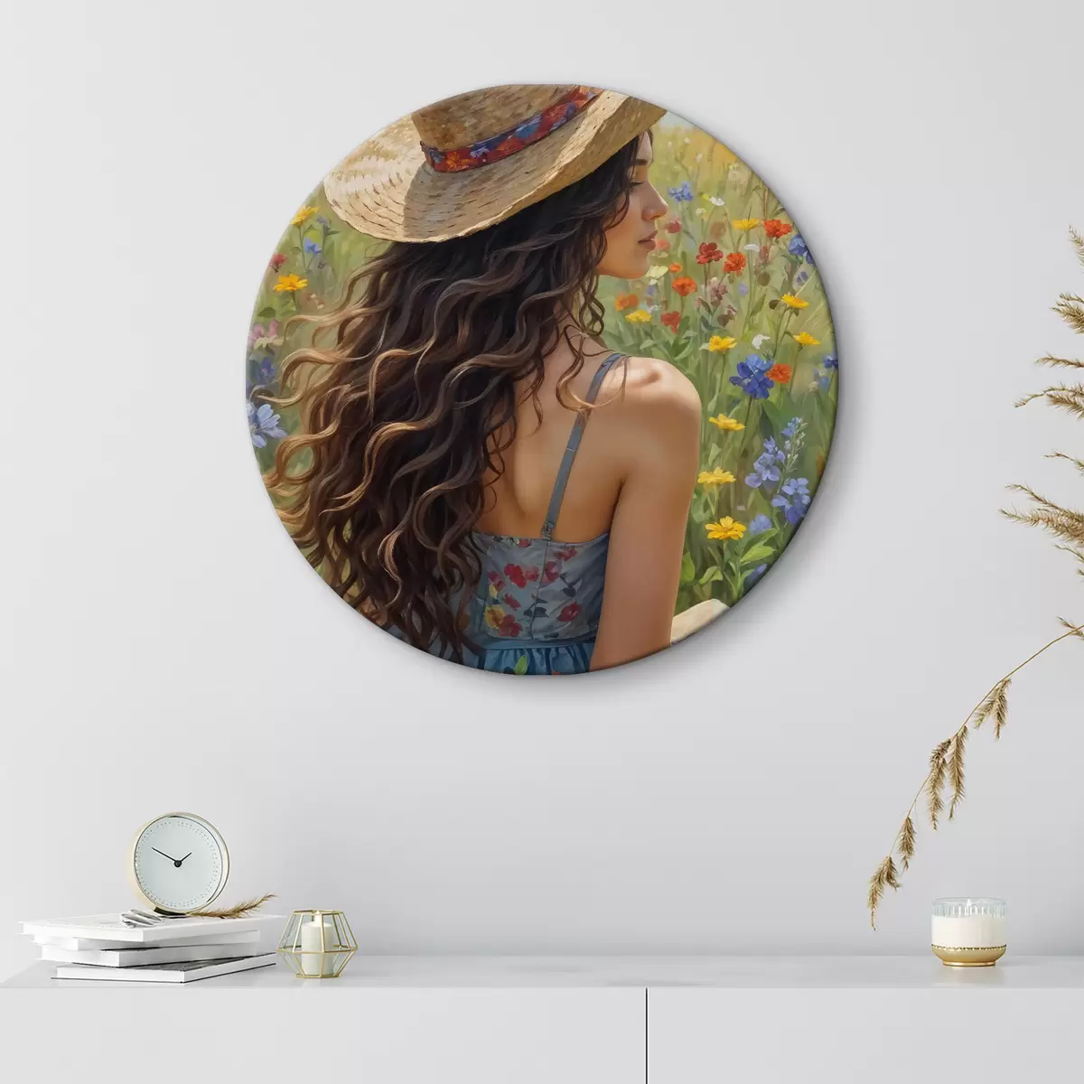 Kép Fiatal nő göndör hajjal, szalmakalapot és virágos ruhát visel, vadvirágos mezőn állva Nr r40560