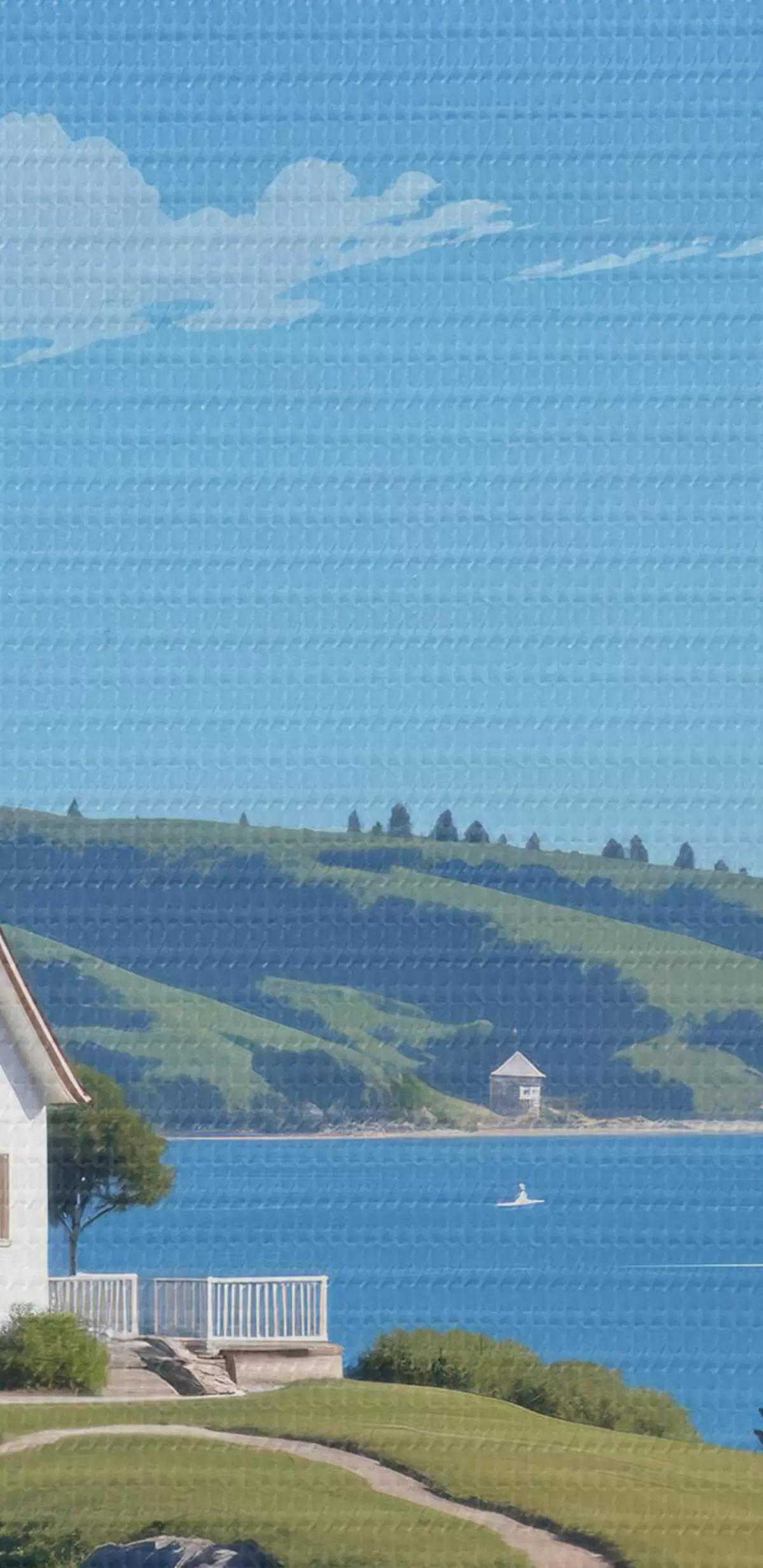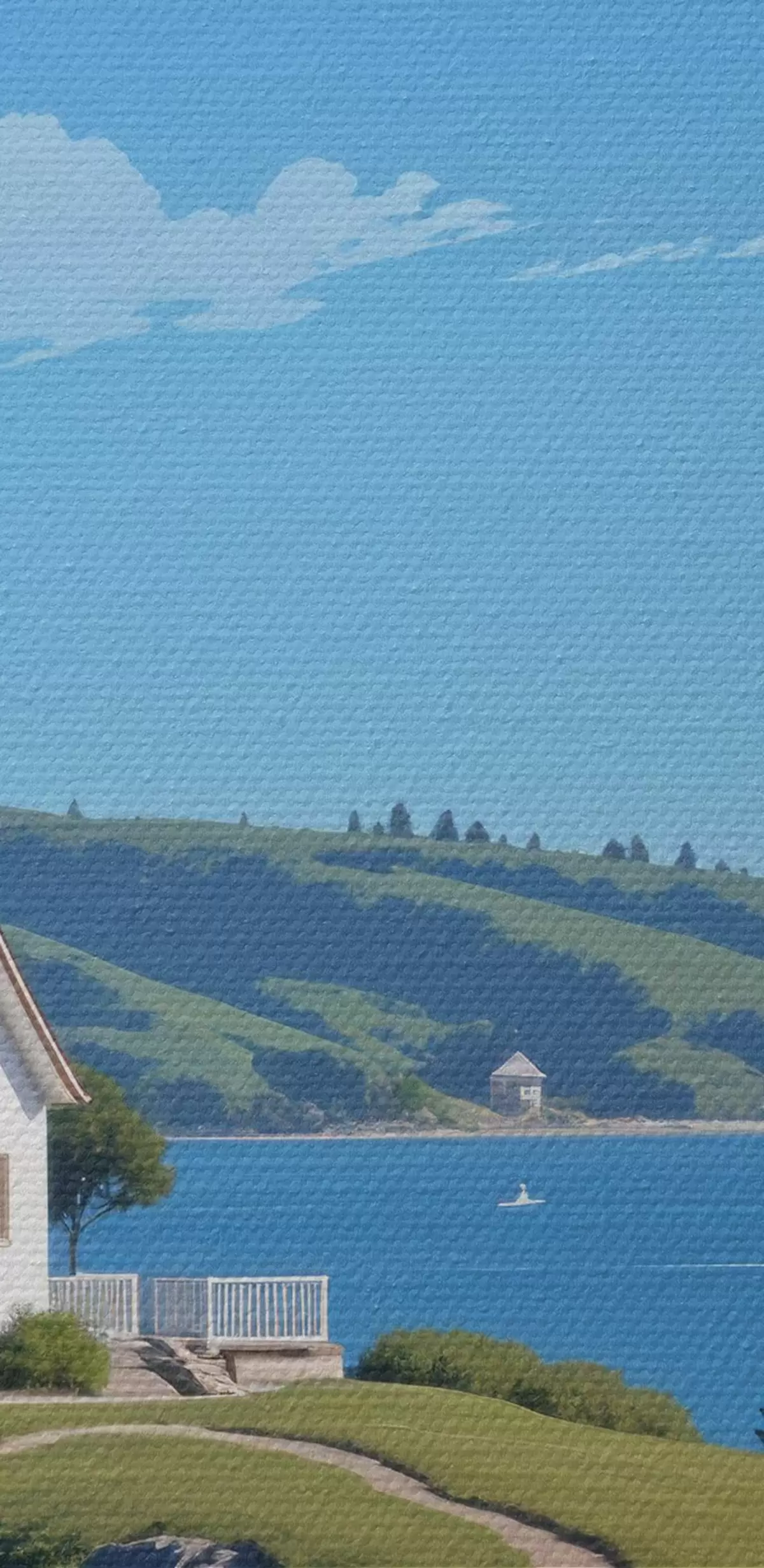 Kép Egy fehér ház egy füves dombon, a háttérben hegyekkel és kék égbolt pufók felhőkkel Nr r40587