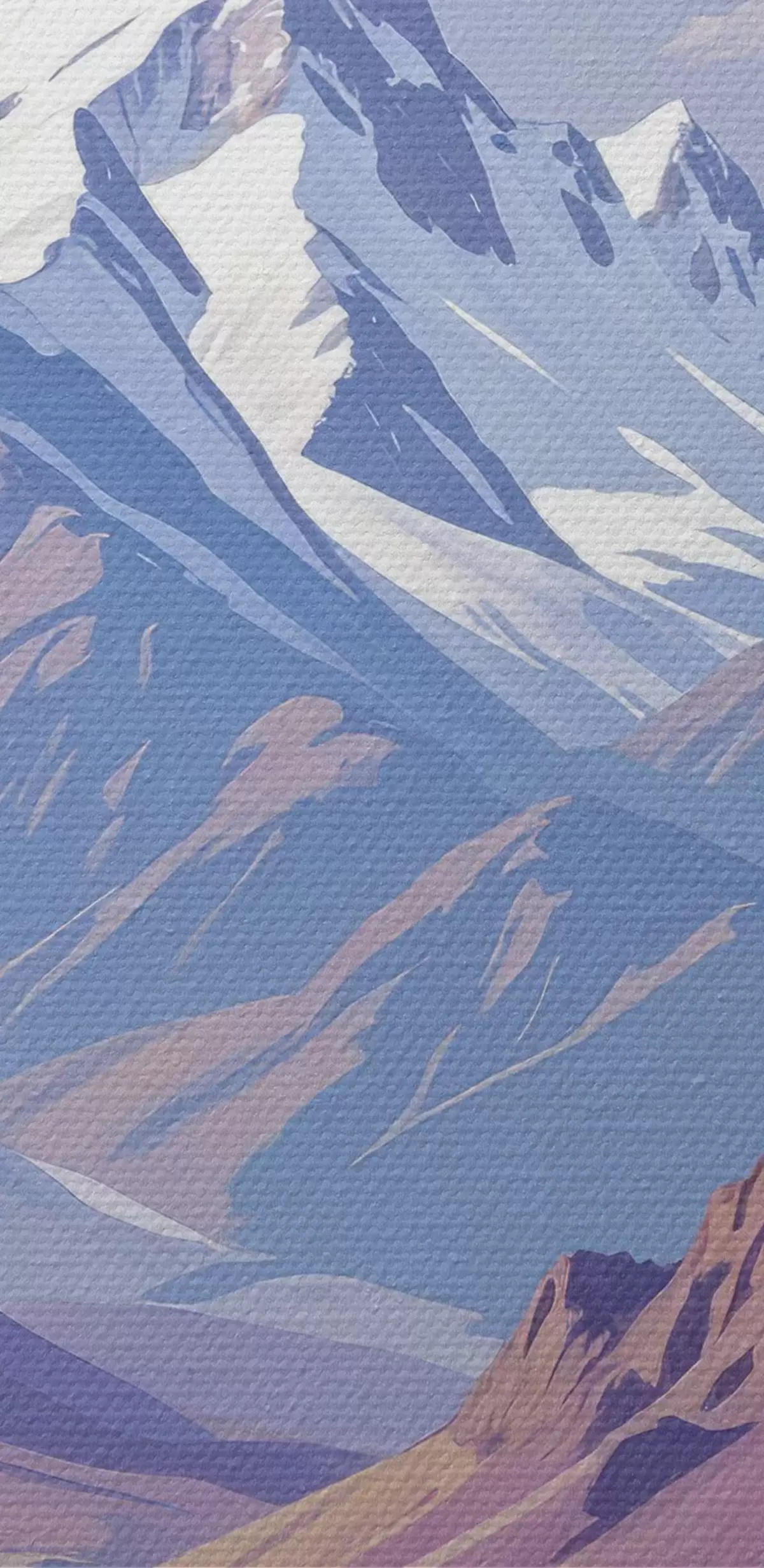 Kép Hófödte hegycsúcsok színes tájban, előtérben fenyőfákkal Nr r40595