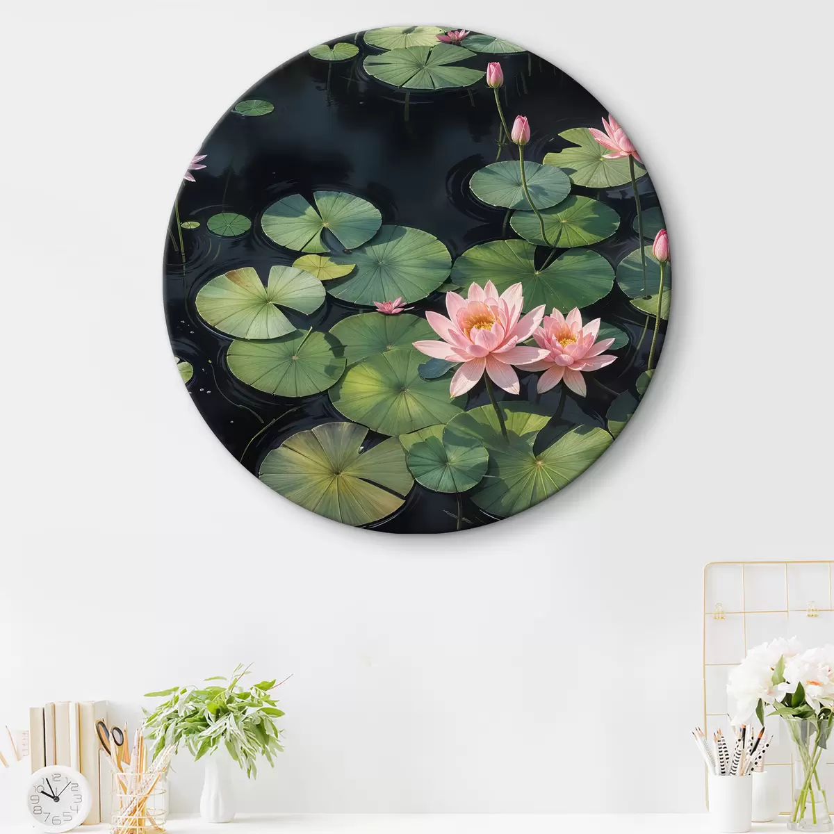 Kép Egy tó rózsaszín tavirózsákkal és zöld liliom szirmokkal, amelyek a felszínen lebegnek, sötét háttérrel körülvéve Nr r40598