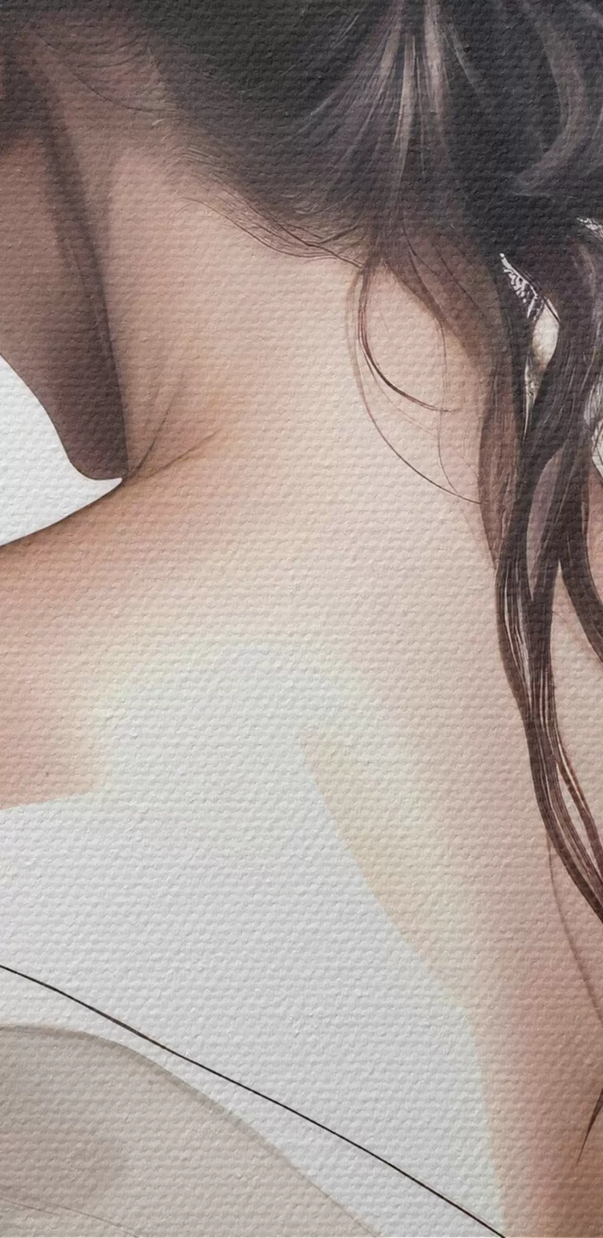 Kép Egy minimalista festmény, amely egy nőt ábrázol, hosszú, sötét, hullámos hajjal, elegáns frizurával, fehér fürdőköpenyben Nr r40605