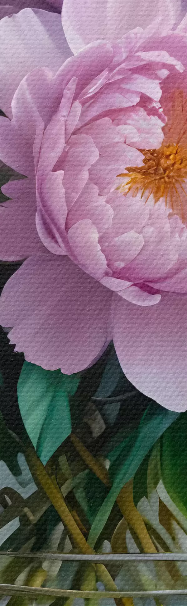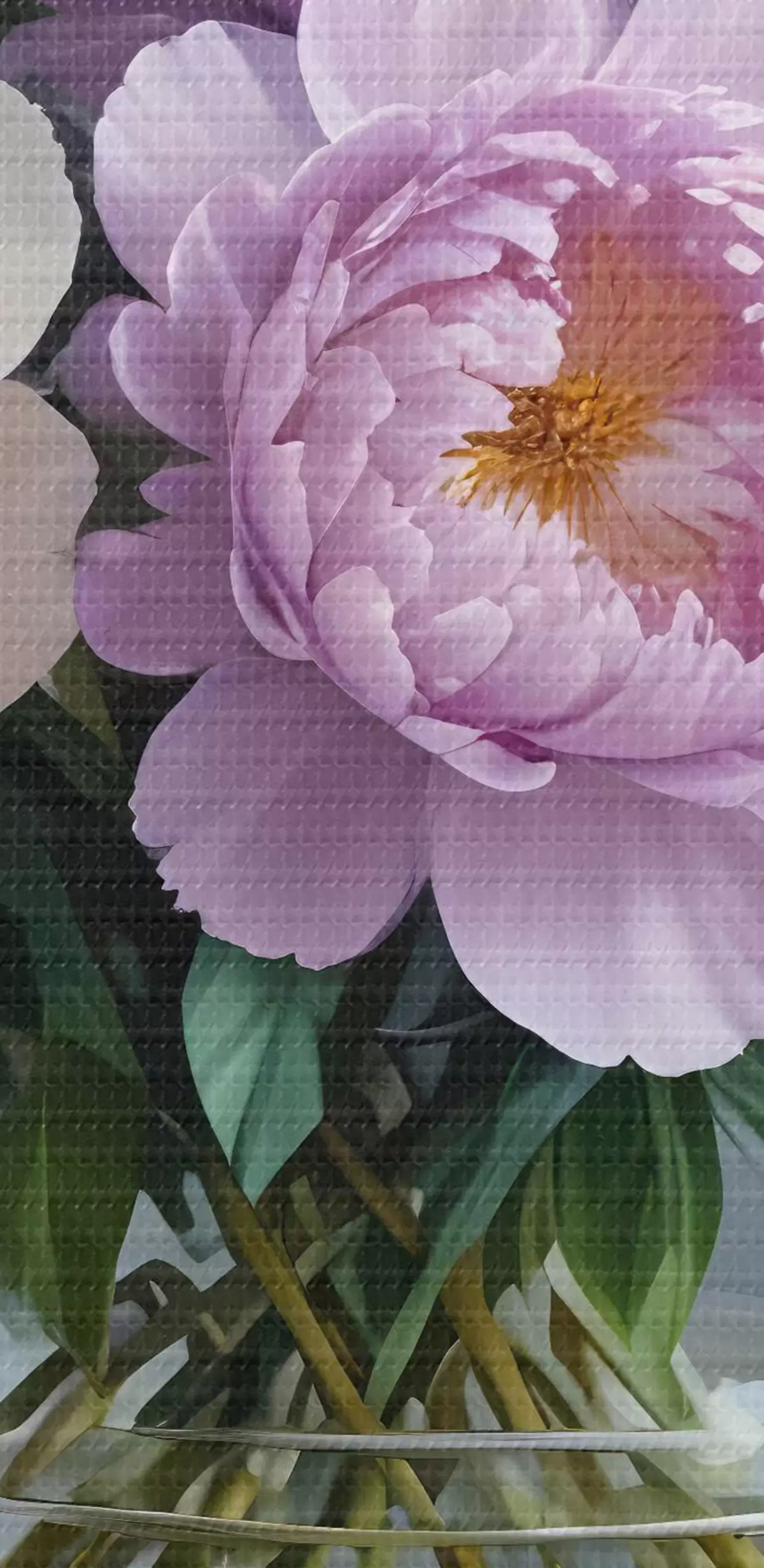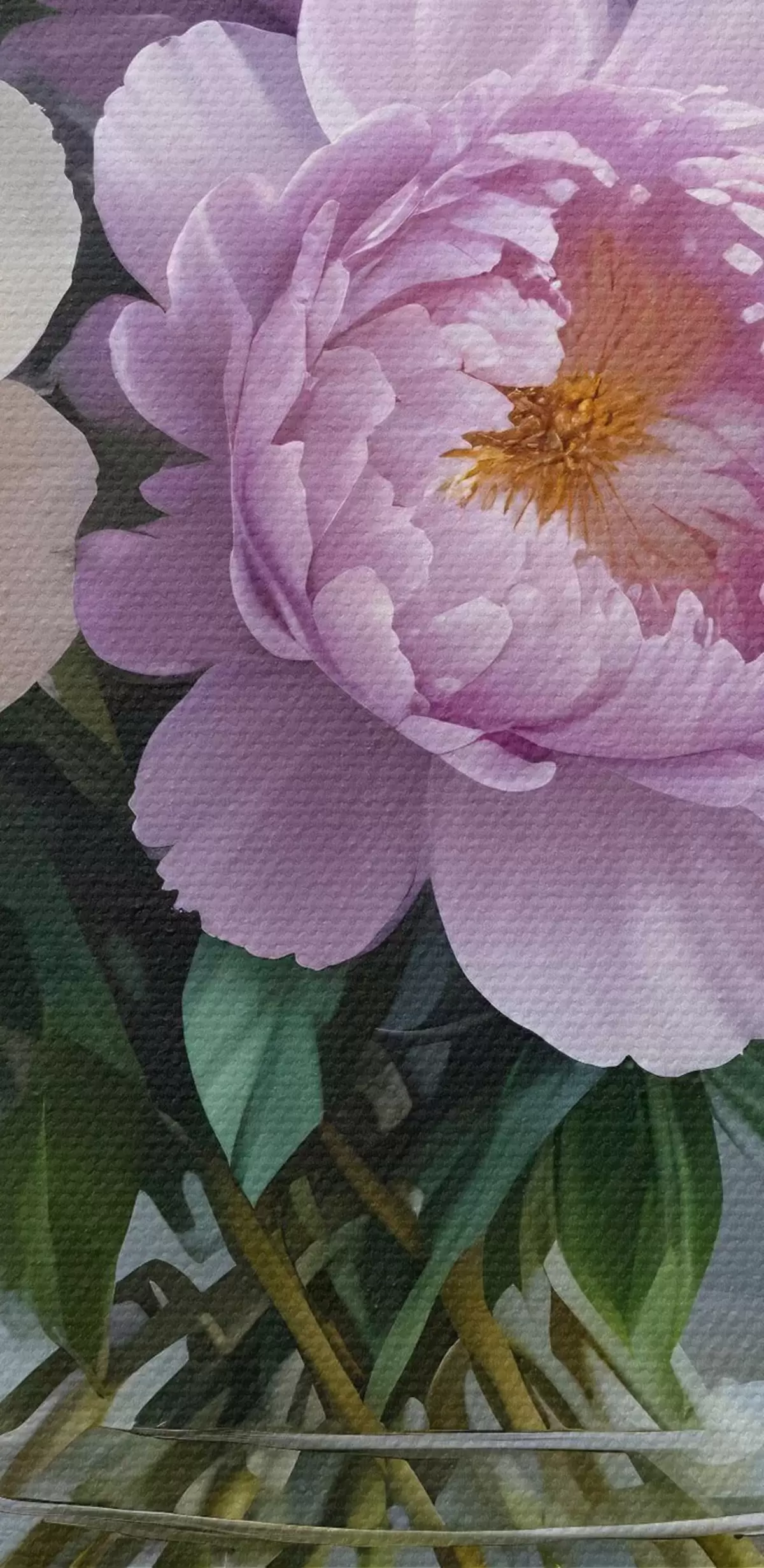 Kép Egy csokor nagy, buja, fehér és rózsaszín bazsarózsákból egy üvegvázában, szürke háttéren Nr r40610