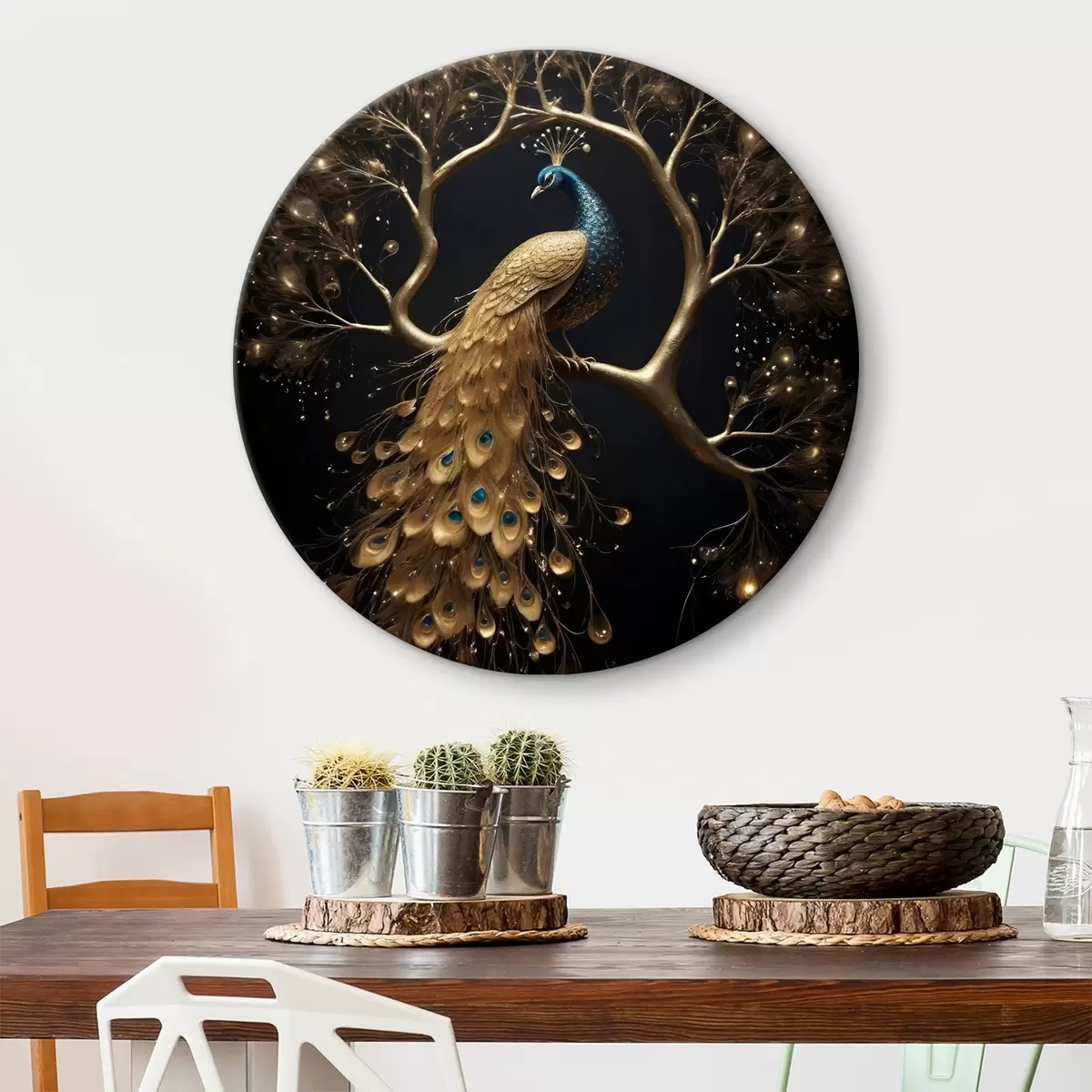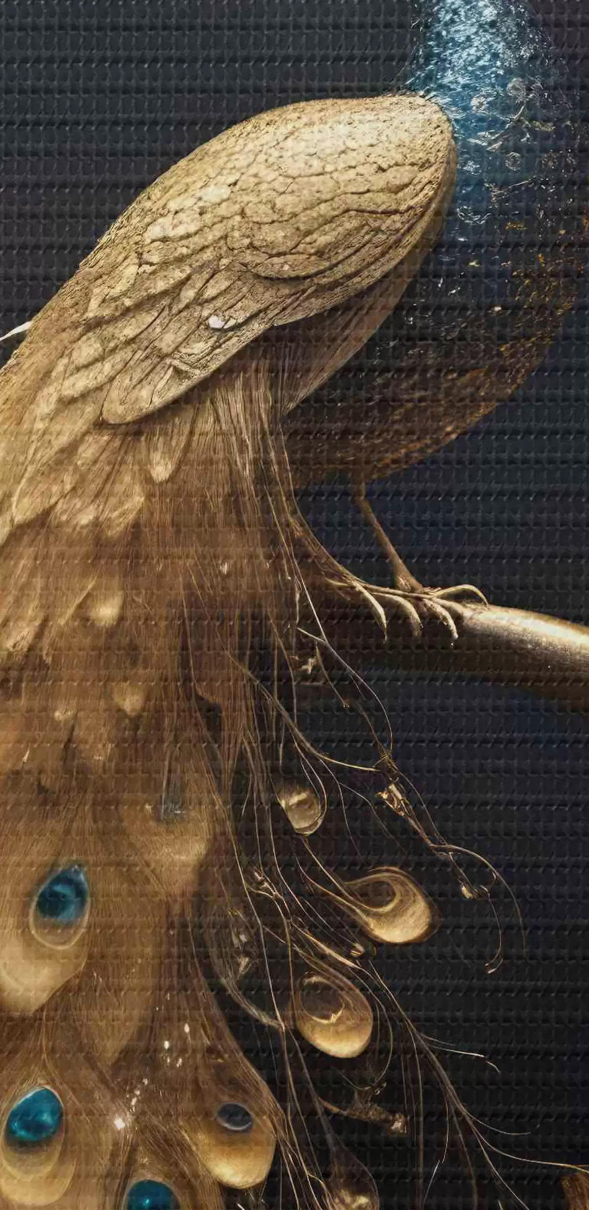 Kép Élénk tollú páva ül egy ágon, sötét háttéren, izzó fák között Nr r40612