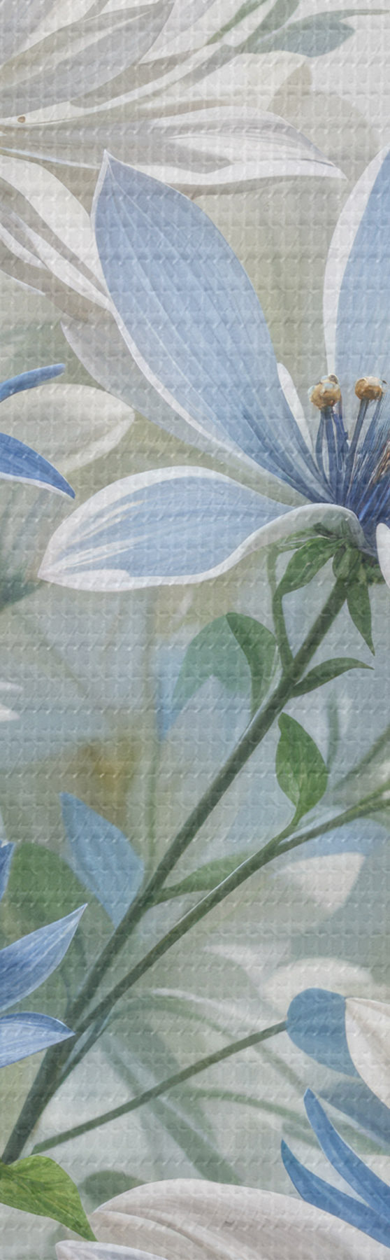 Kép Mező fehér és kék százszorszép virágokkal, zöld levelekkel és szárakkal, lágy, elmosódott háttérrel Nr r41086