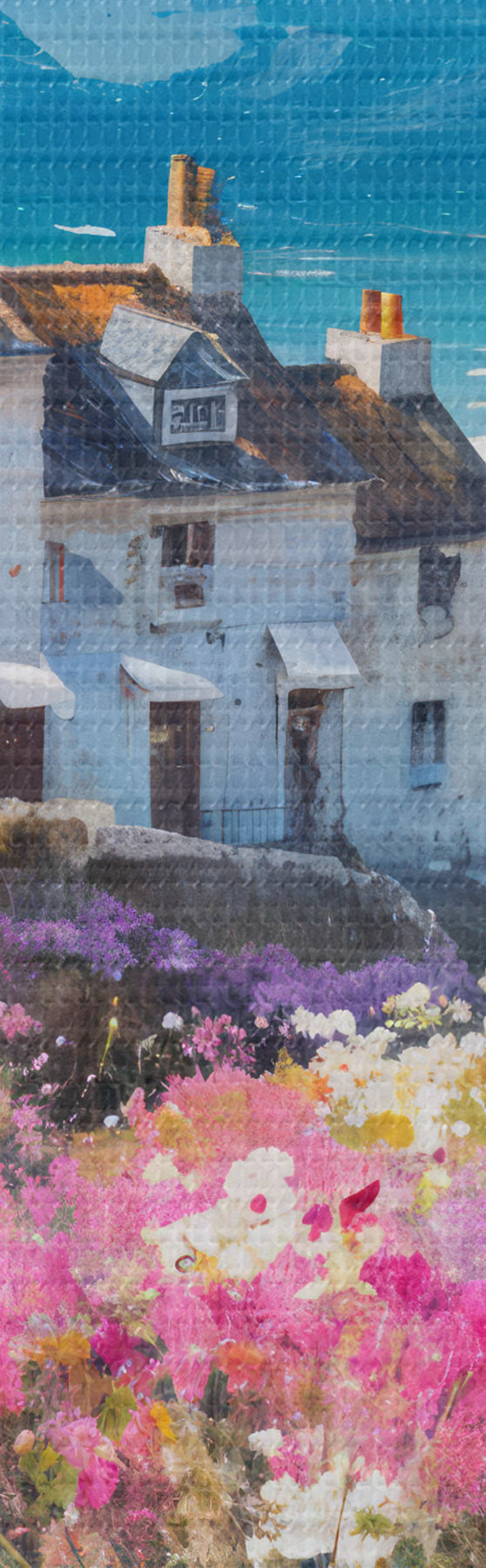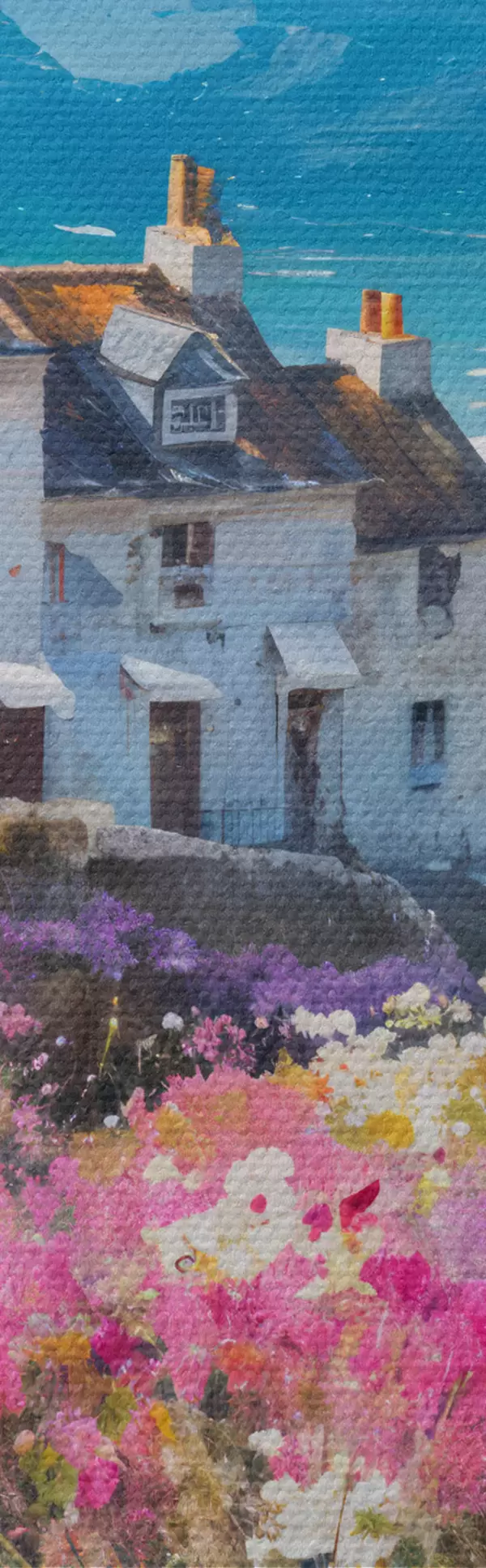 Kép Színes olajfestmény, amely egy tengerparti várost ábrázol, fehér házakkal és egy élénk virágos kerttel az előtérben Nr r41090