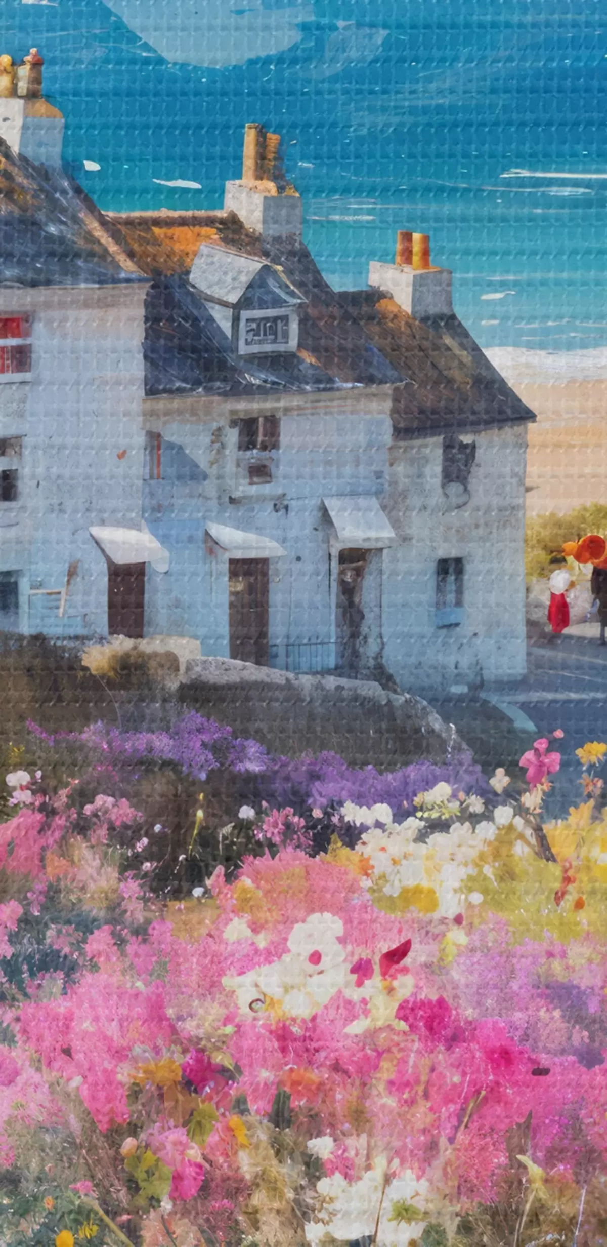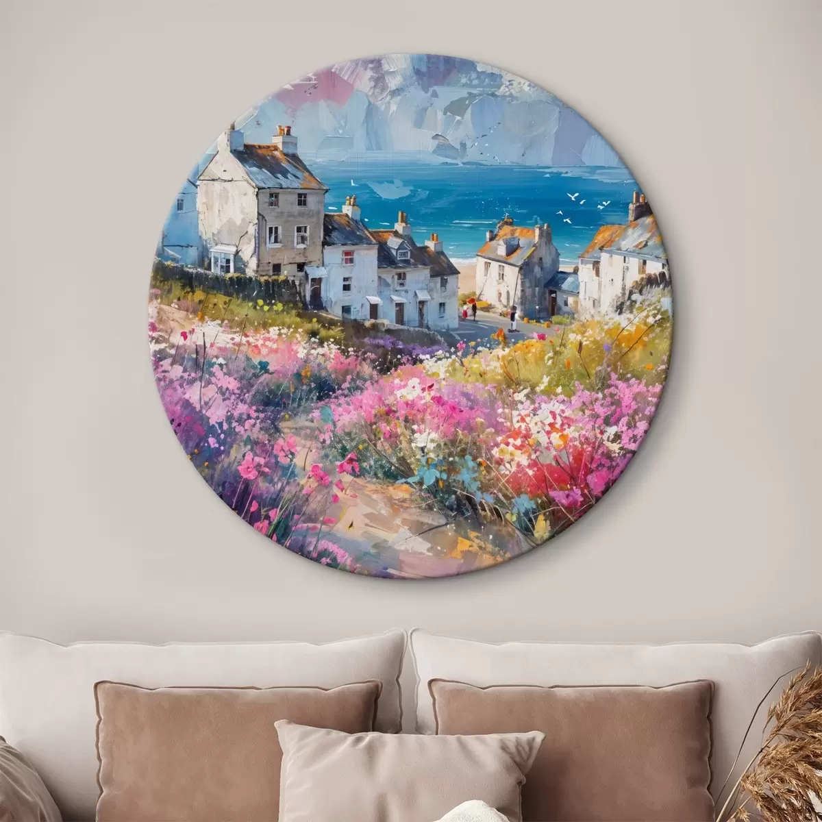 Kép Színes olajfestmény, amely egy tengerparti várost ábrázol, fehér házakkal és egy élénk virágos kerttel az előtérben Nr r41090