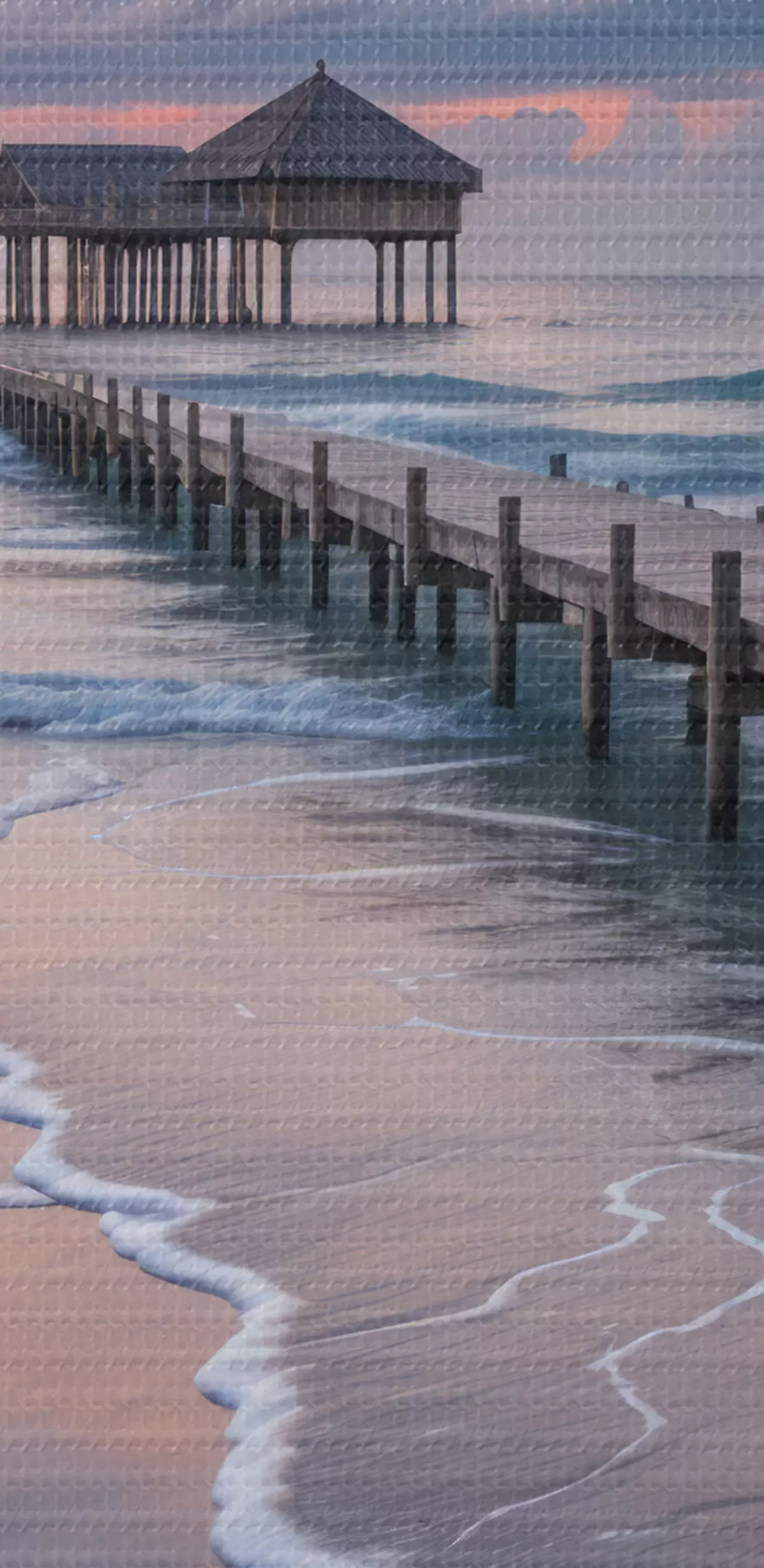 Kép Fából készült móló, kilátással a nyugodt óceánra naplementében, színes felhőkkel Nr r41091
