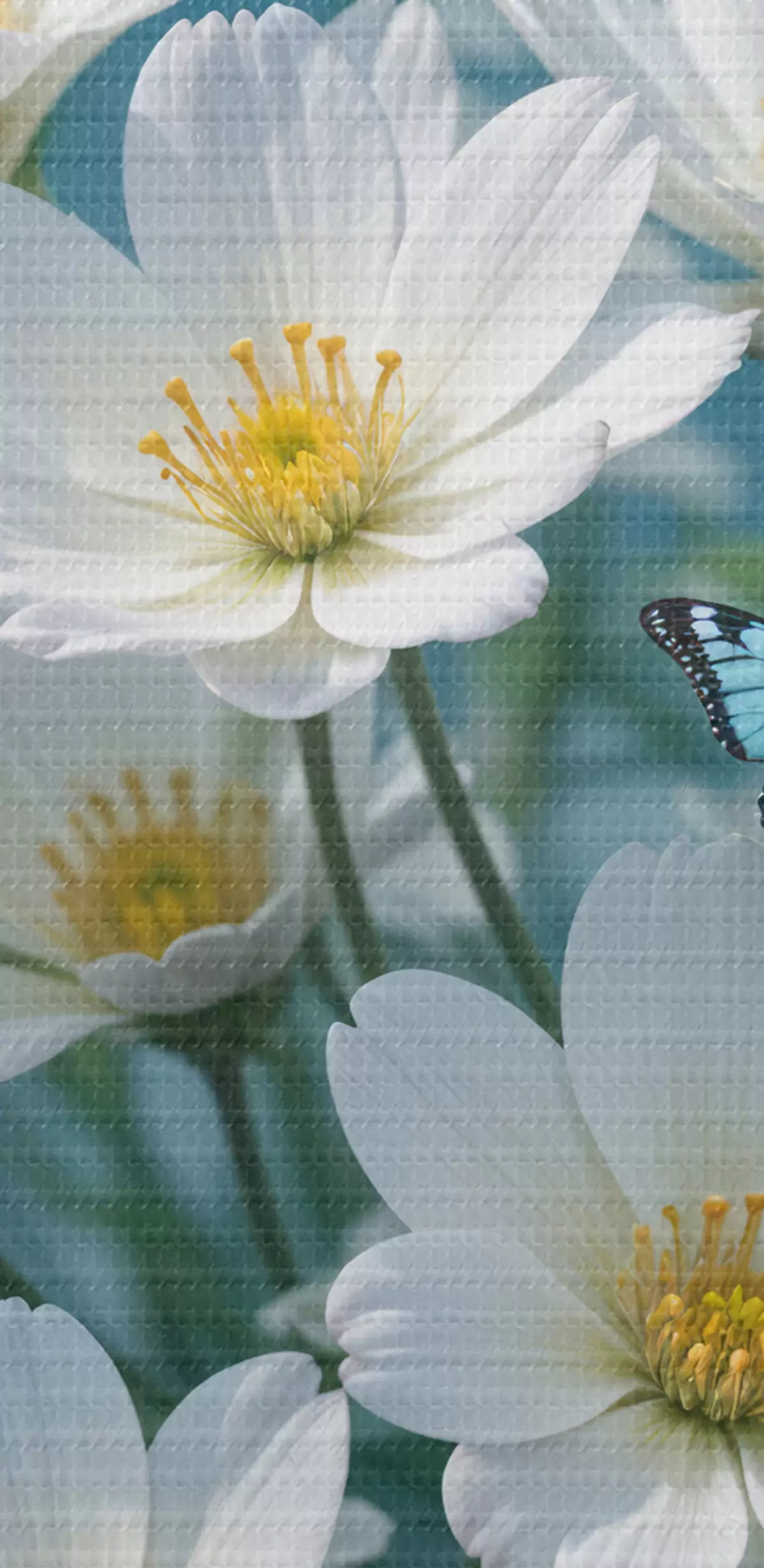 Kép Fehér százszorszép virágok mezője, közöttük kék pillangókkal, amelyek elmosódott kék háttéren repkednek Nr r41096