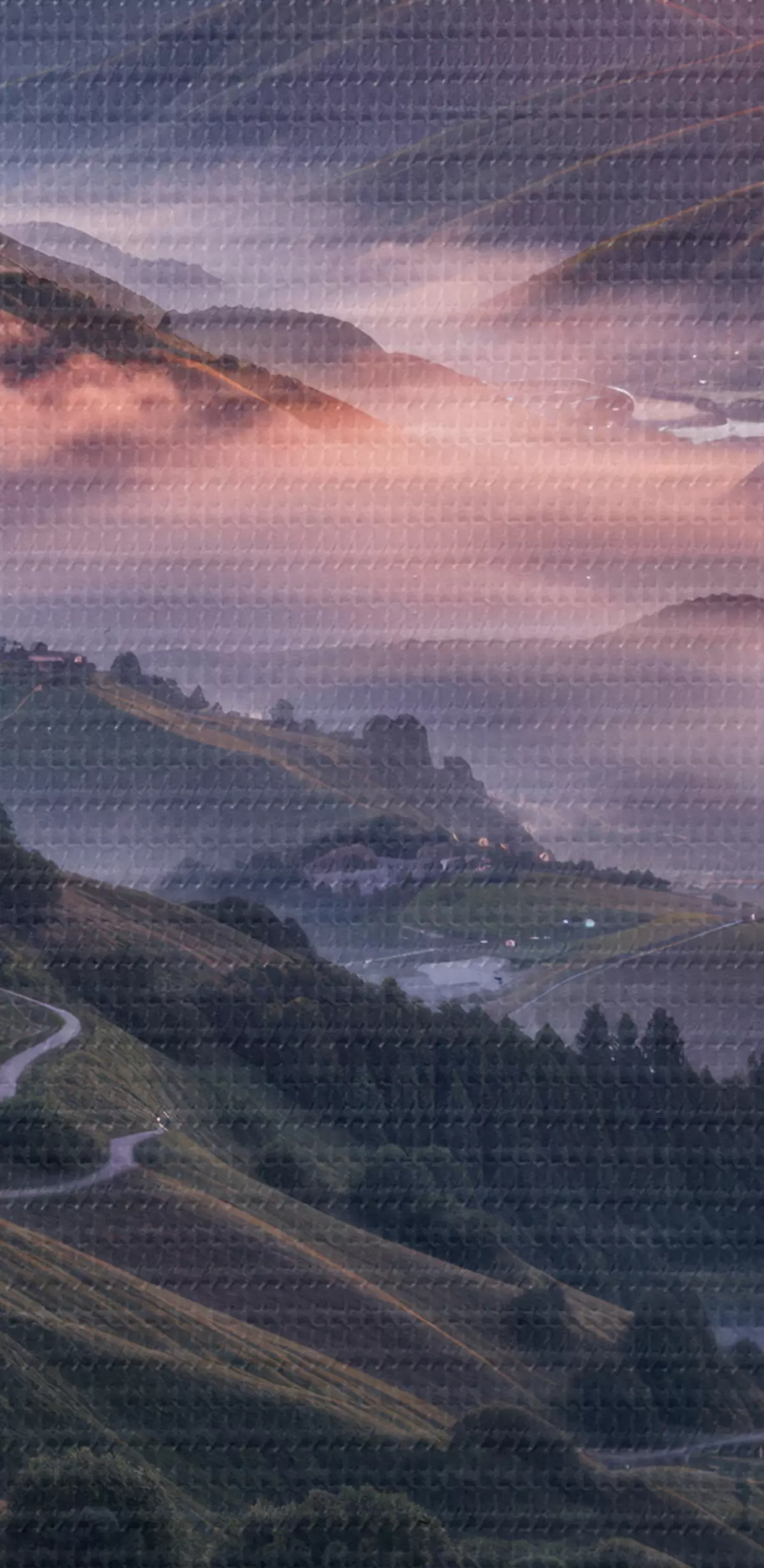 Kép Lélegzetelállító táj, élénk naplemente egy rózsaszín virágfürtökkel borított hegyvidék felett Nr r41263