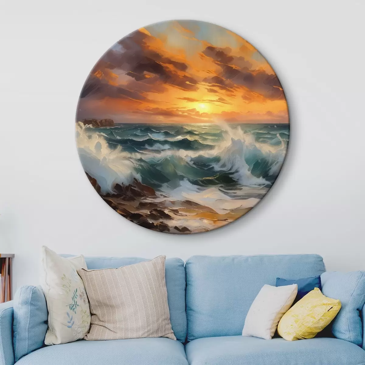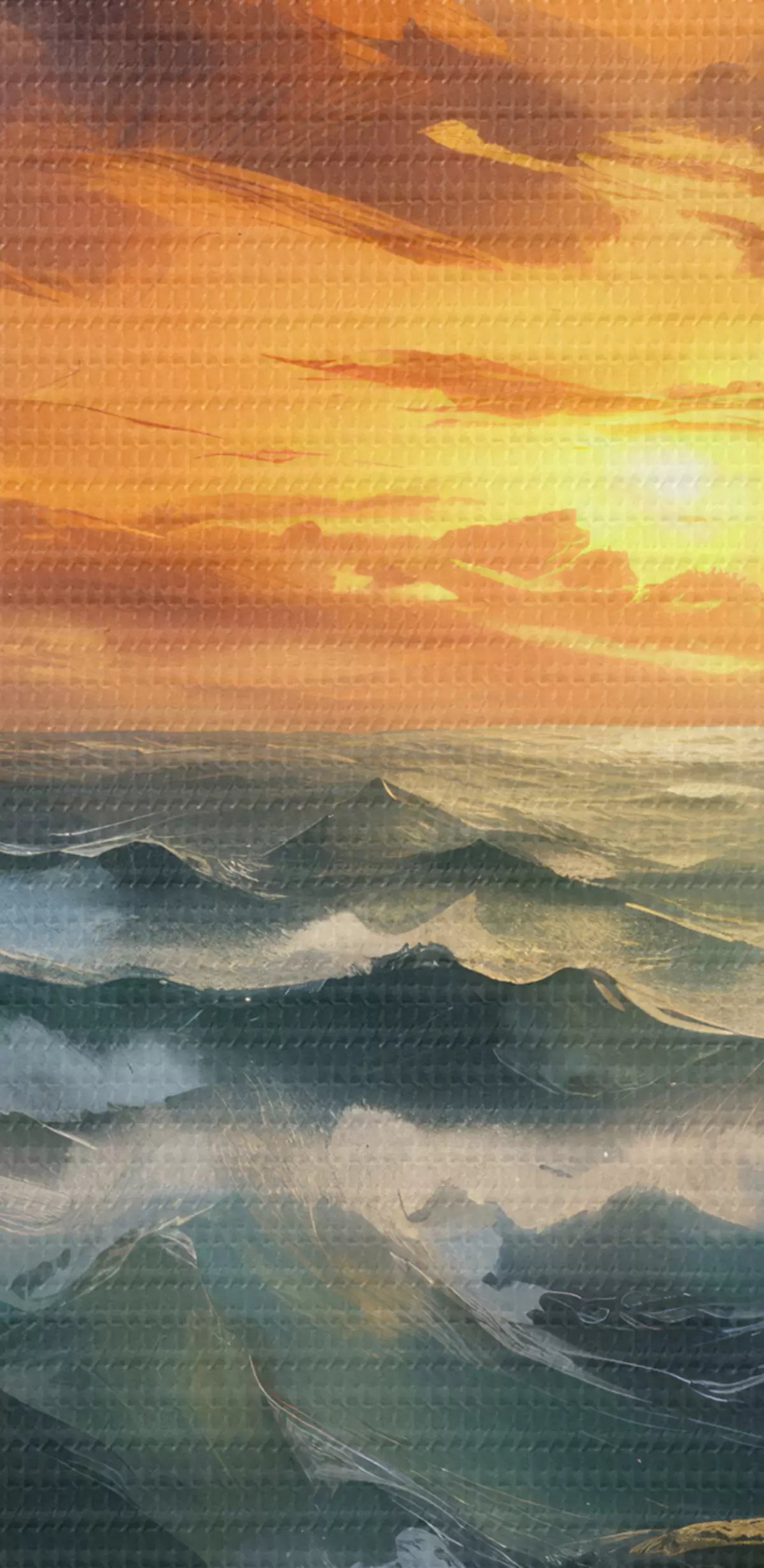 Kép Drámai tengeri táj, hullámokkal és sziklás sziklákkal, narancssárga és sárga felhős égbolt előtt Nr r41266