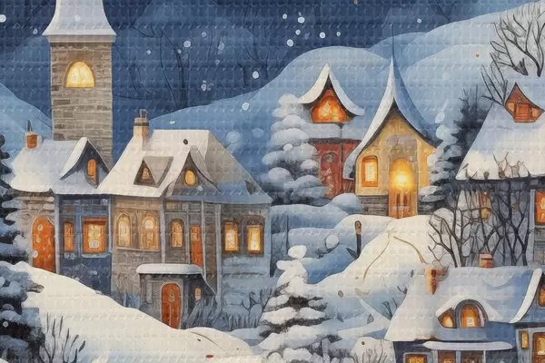 Kép Téli táj hóval borított vidéki házakkal a csillagos éjszakai égbolt hátterében Nr r41275