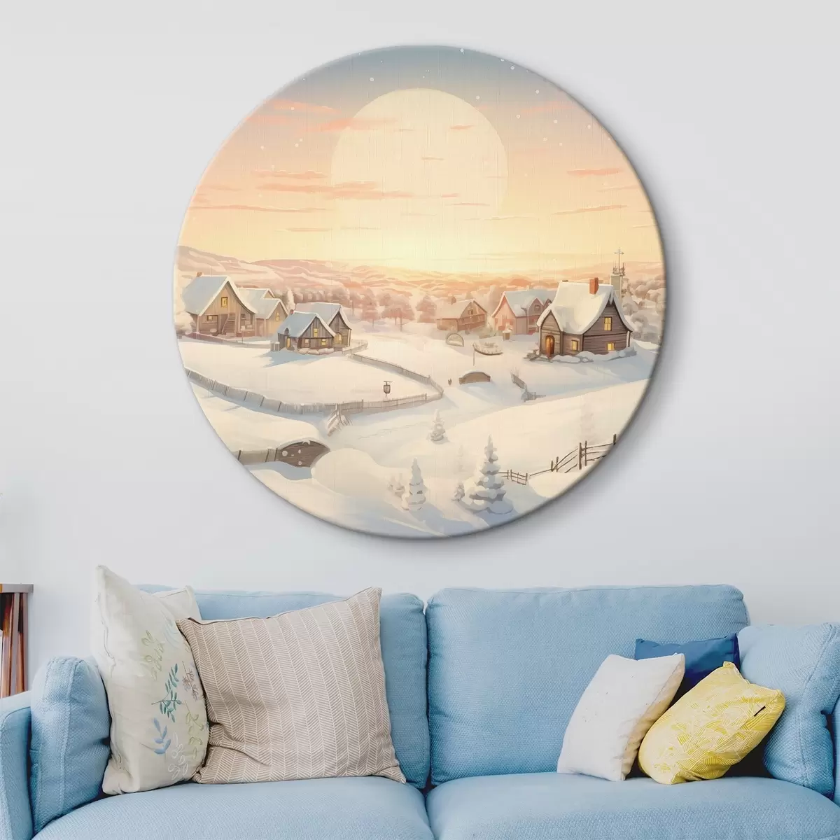 Kép Téli falu naplementében, hóval borított házak, fenyőfák Nr r41380