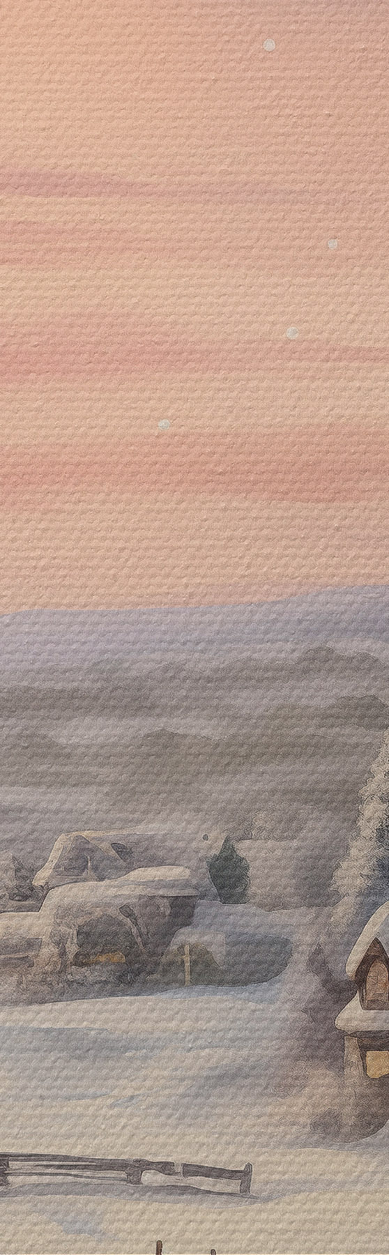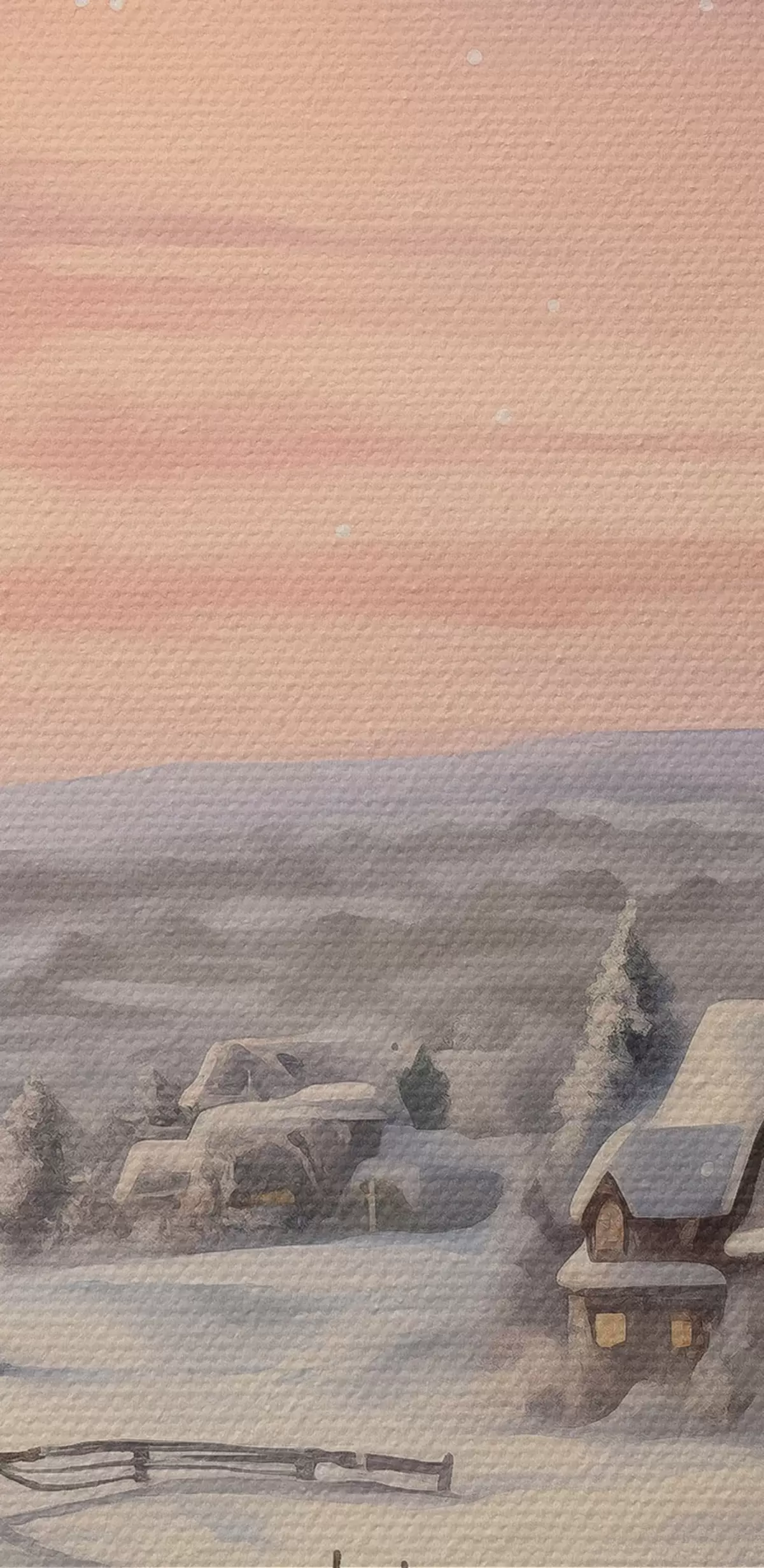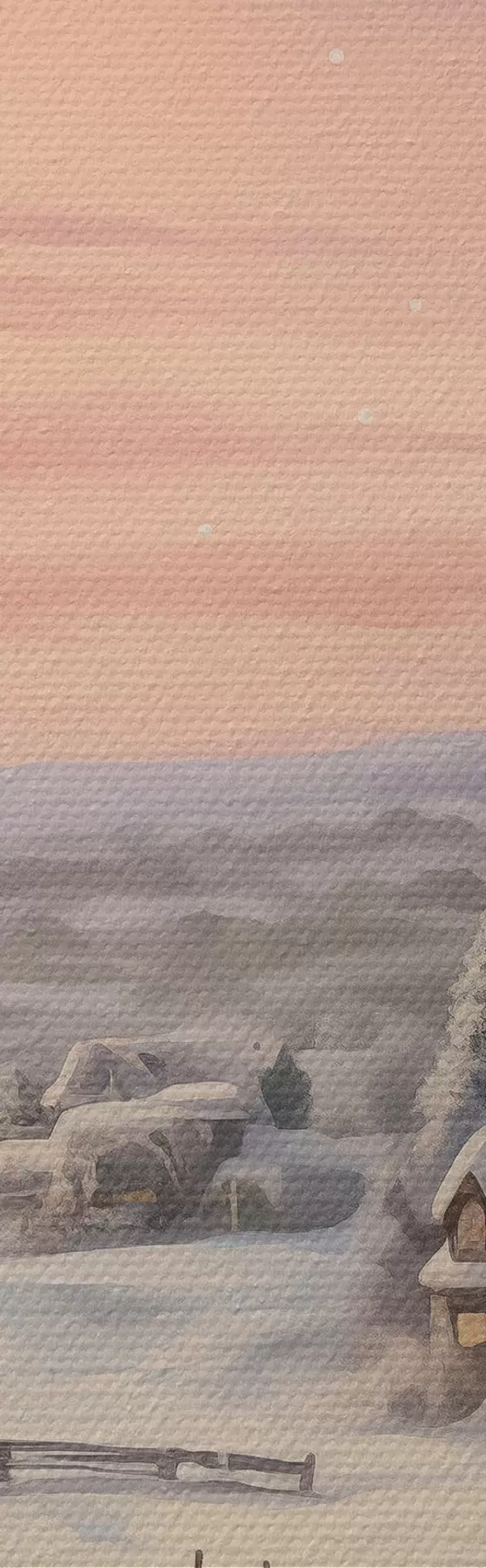 Kép Naplemente a téli faluban, rusztikus, akvarell, hópelyhek, hóvirágok Nr r41386