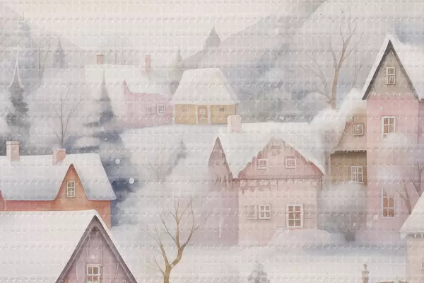 Kép Akvarell téli falu, fenyőerdő, házak, hegyek, lágy pasztell színek Nr r41388