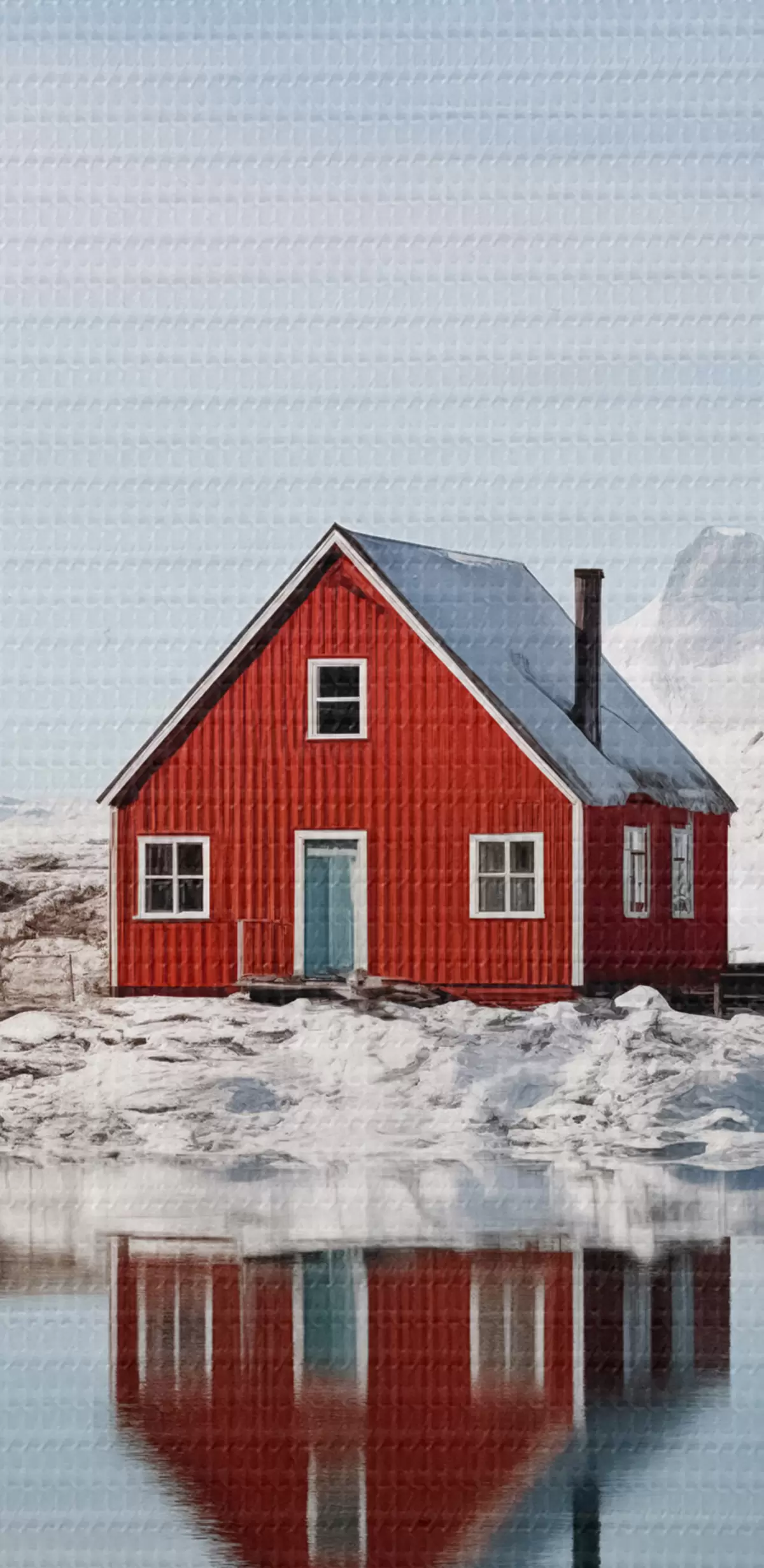 Kép Minimalista téli táj piros ház a tó mellett Nr r41437