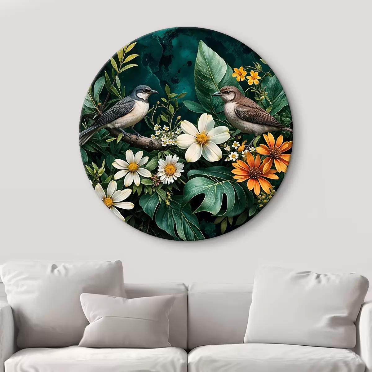 Kép Kis madarak ülnek az ágakon, körülvéve buja trópusi lombozat, beleértve a nagy zöld leveleket és színes virágokat Nr r42220