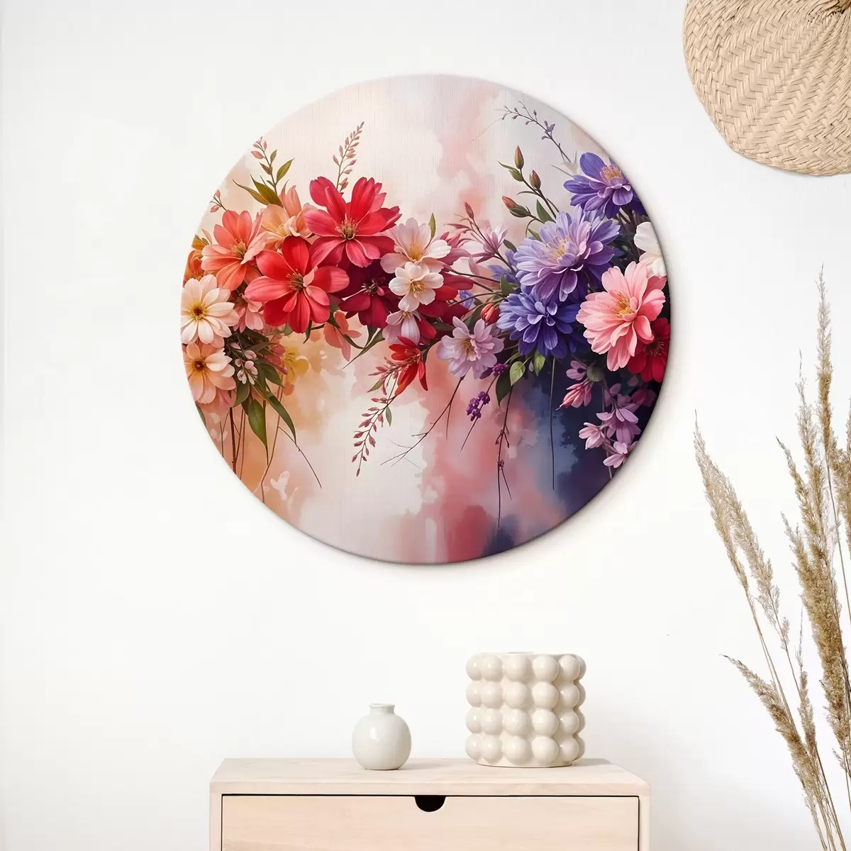 Kép Színes virágok, köztük piros, rózsaszín és lila dáliák, százszorszépek és más virágok lágy, elmosódott háttér előtt Nr r42234