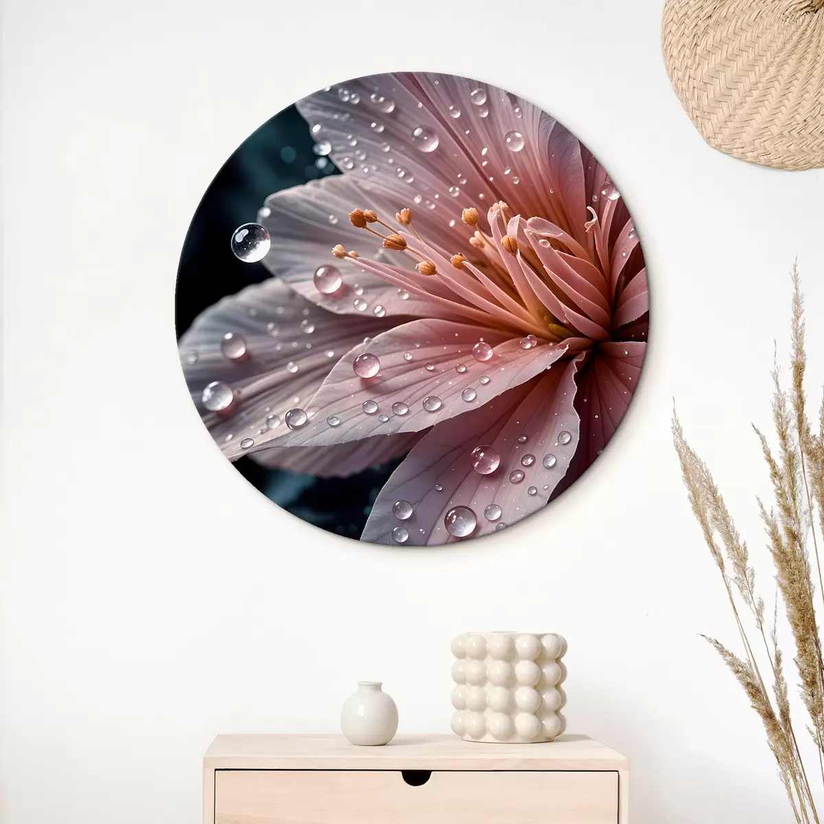 Kép Közelkép egy rózsaszín virágról, amelynek finom szirmait vízcseppek borítják, sötét háttér előtt Nr r42237