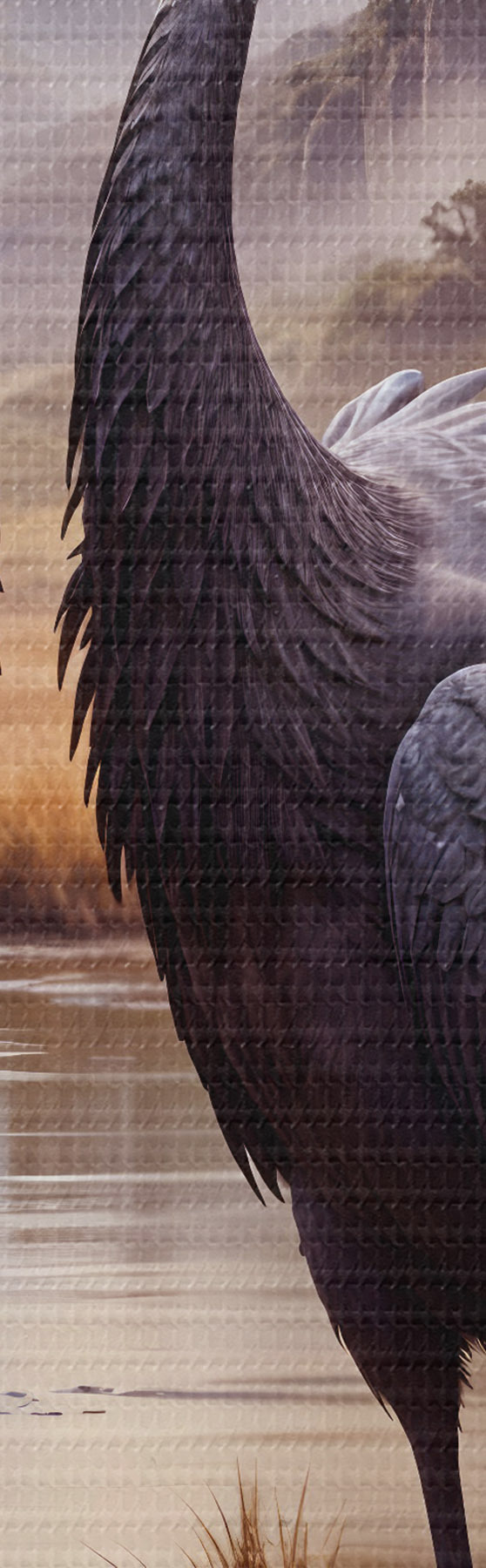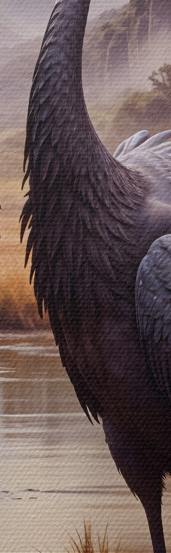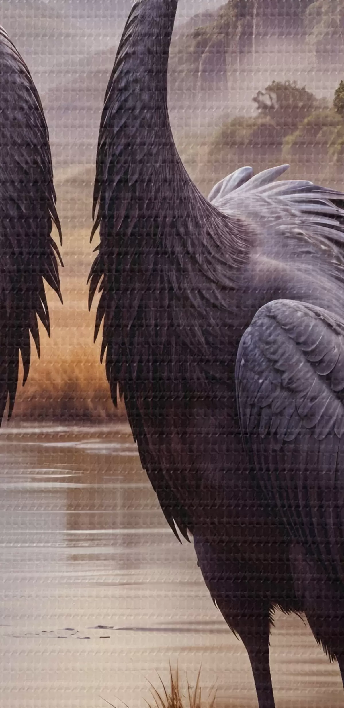 Kép Két nagy fekete daru áll egy sekély tóban, a háttérben hegyvidéki tájjal Nr r42240