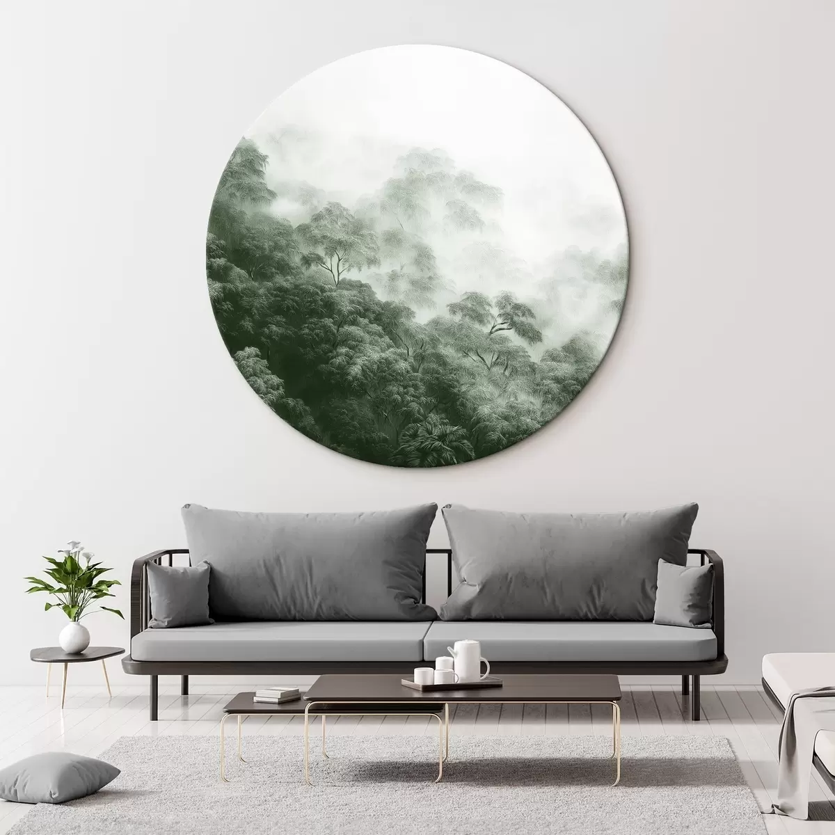 Kerek festmények Trópusi erdő a ködben, pálmafák, zöld színek r42371