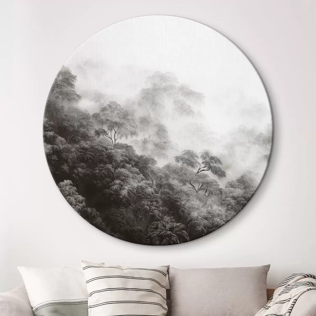 Kerek festmények Trópusi erdő a ködben, pálmafák, szürke színek r42371v1