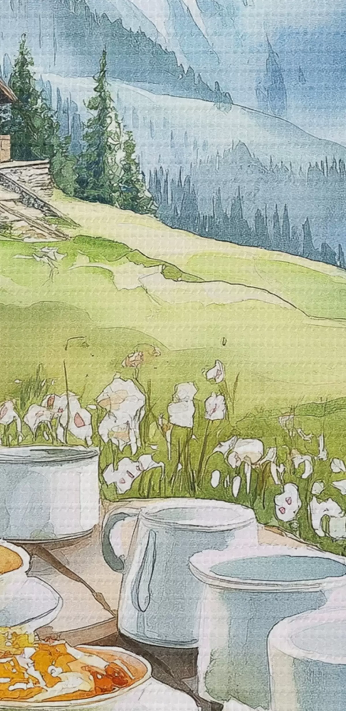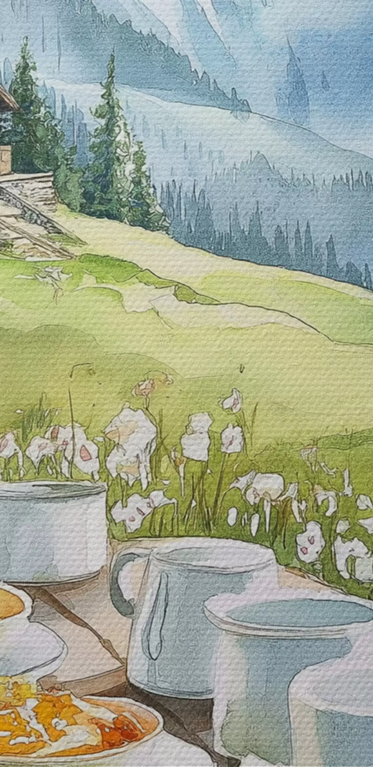Kép Reggeli az Alpokban, hegyek, erdő, természet, nyár, akvarell stílusban Nr r42426