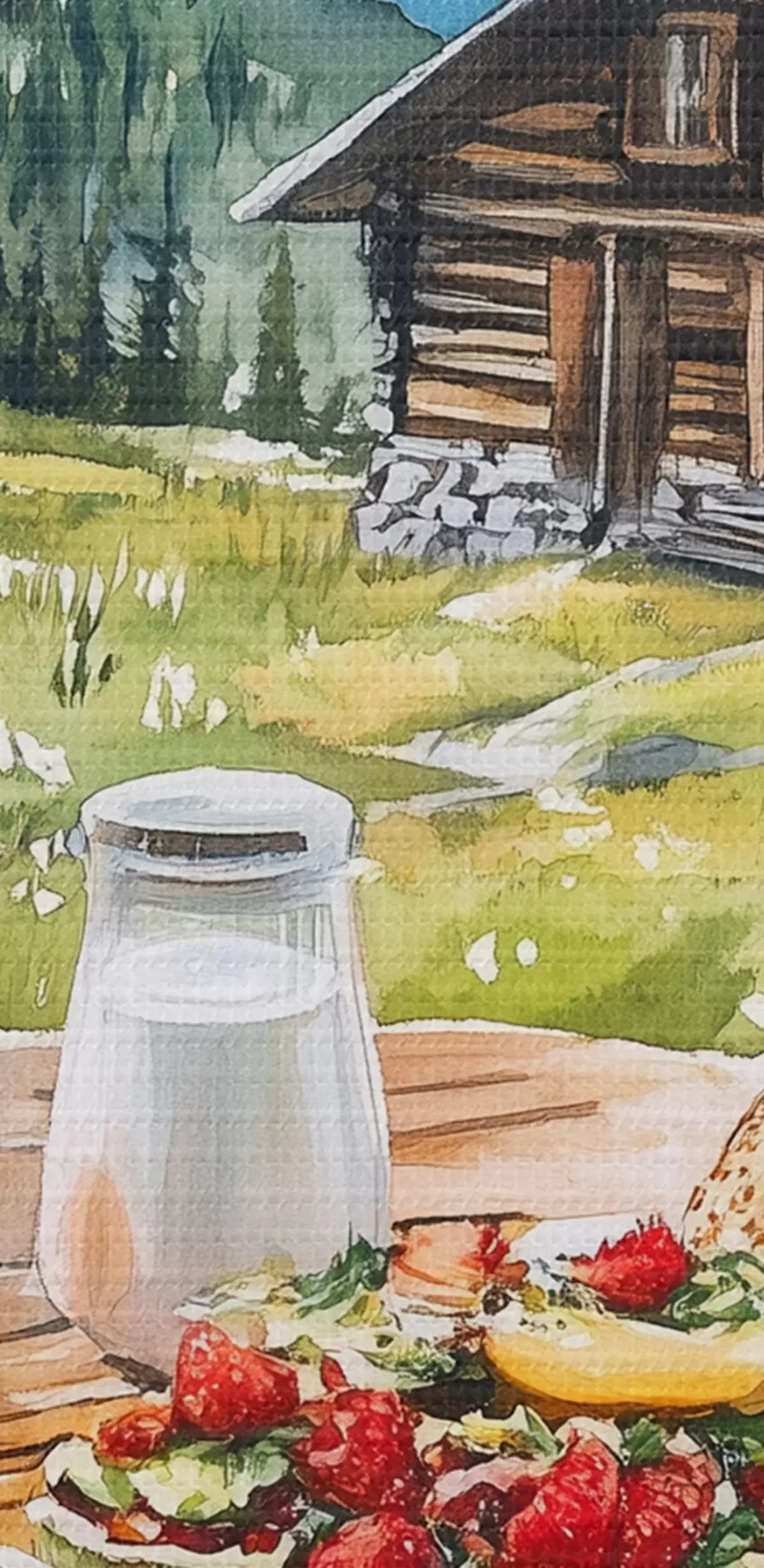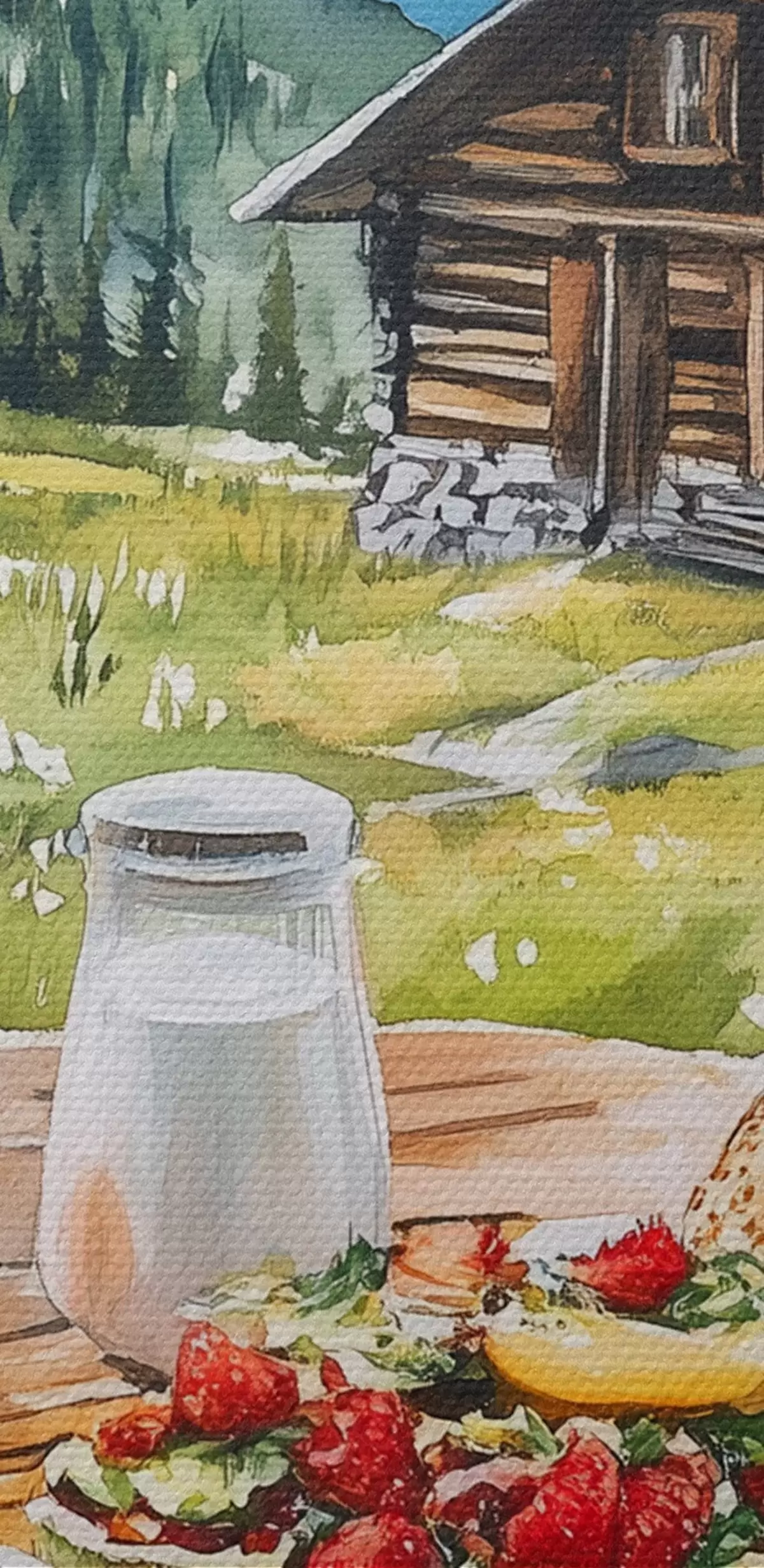 Kép Gyönyörű nyári tájak hegyekkel, erdővel és virágokkal, reggeli, akvarell stílusban Nr r42427