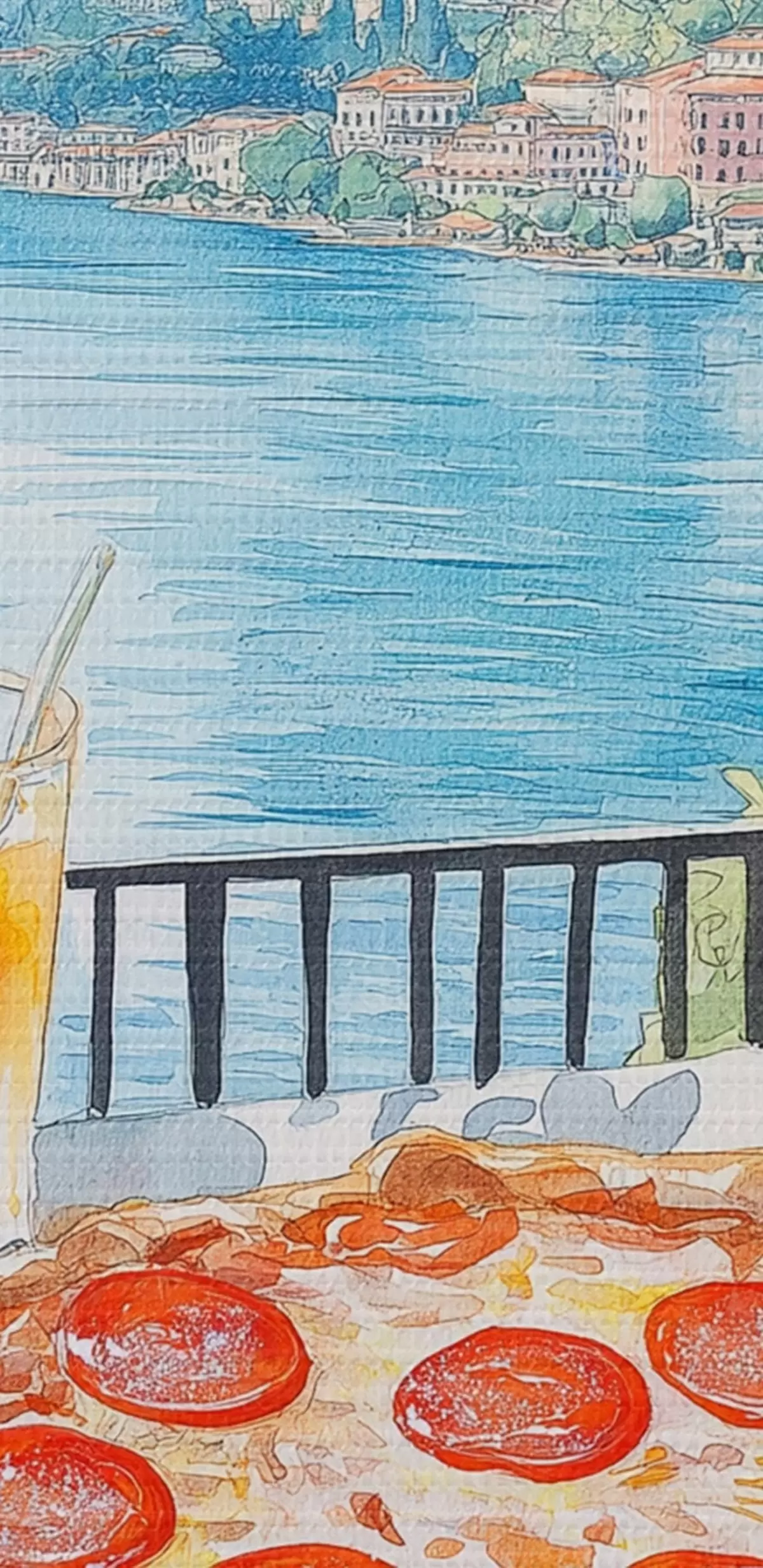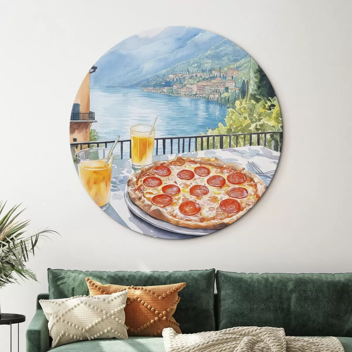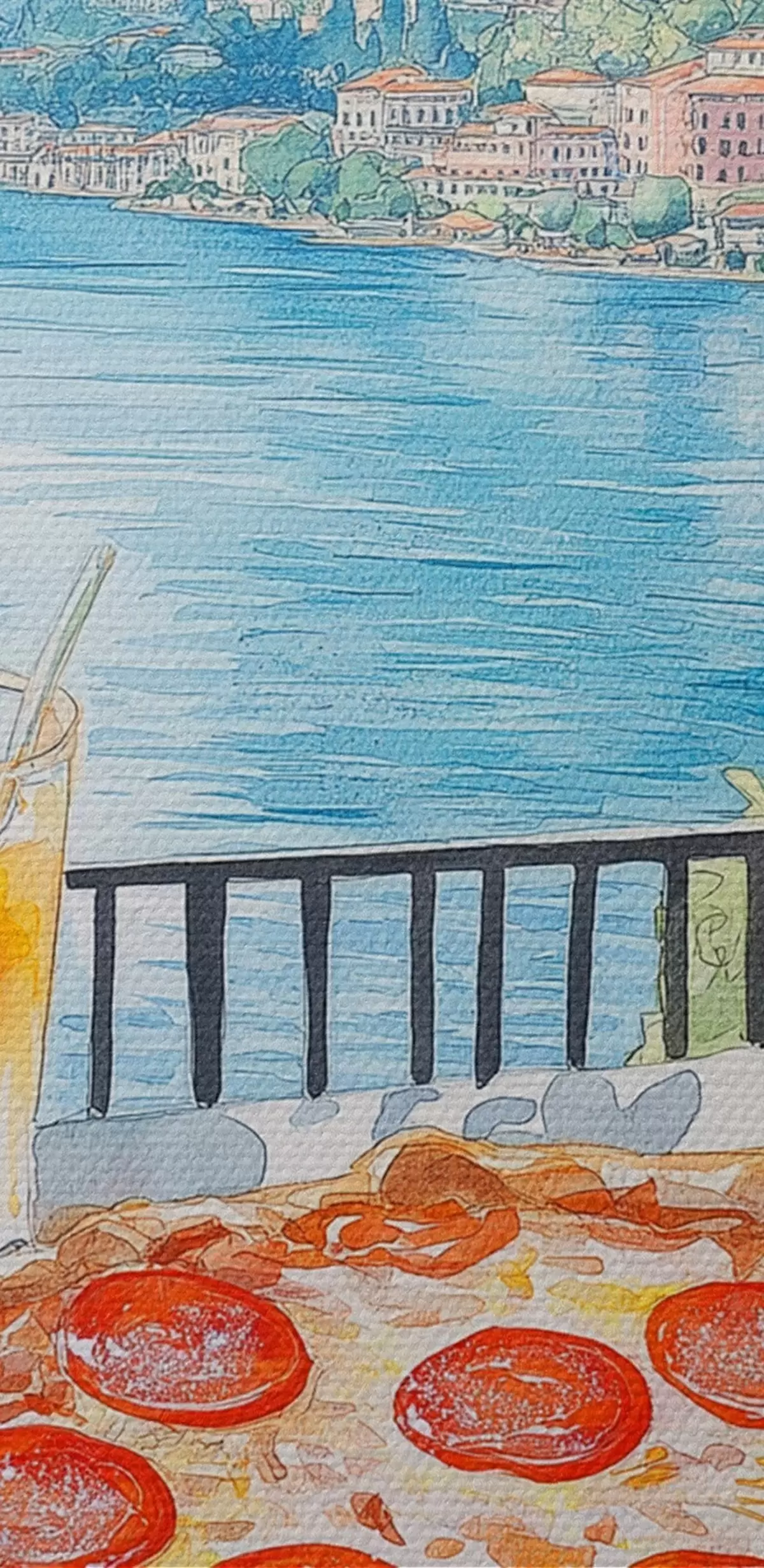 Kép Brunch Olaszországban, akvarell stílusban, pizza margarita, tó, nyári természet, nyár Nr r42436