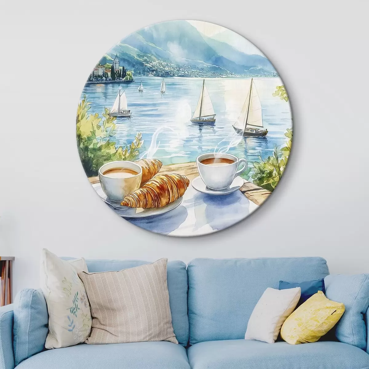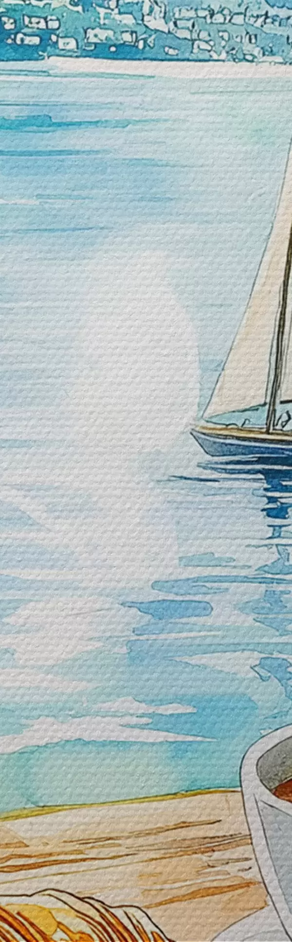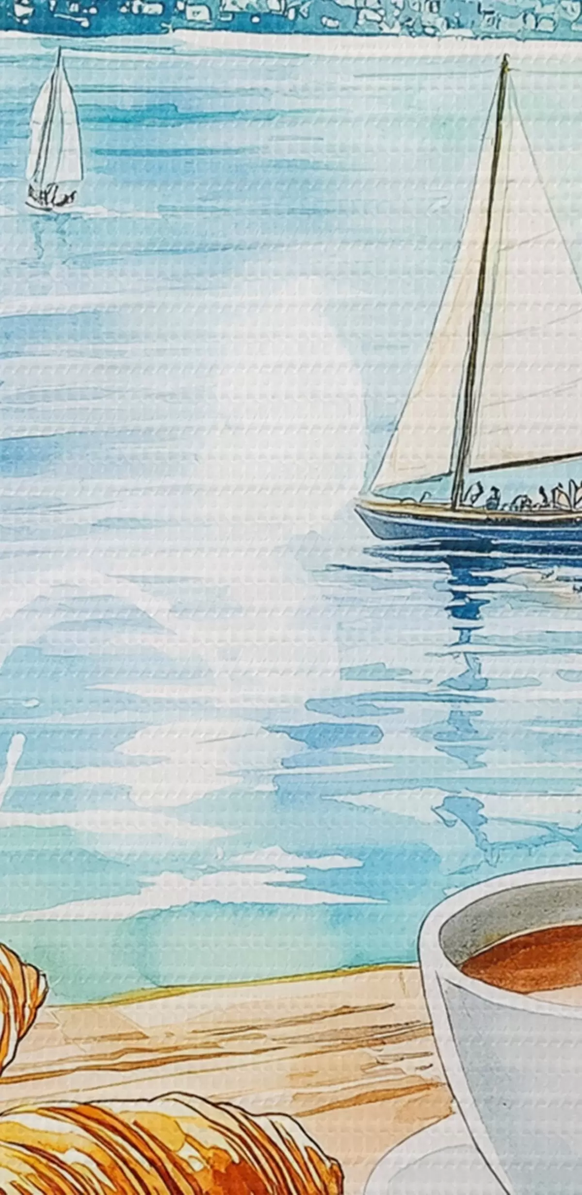Kép Nyári tó vitorlásokkal, kávéscsészékkel, croissantokkal, akvarell stílusban Nr r42441