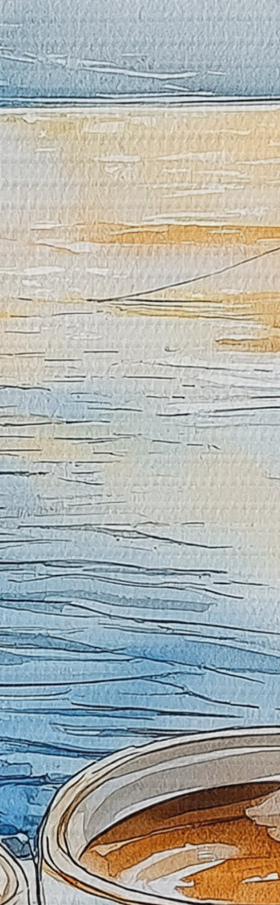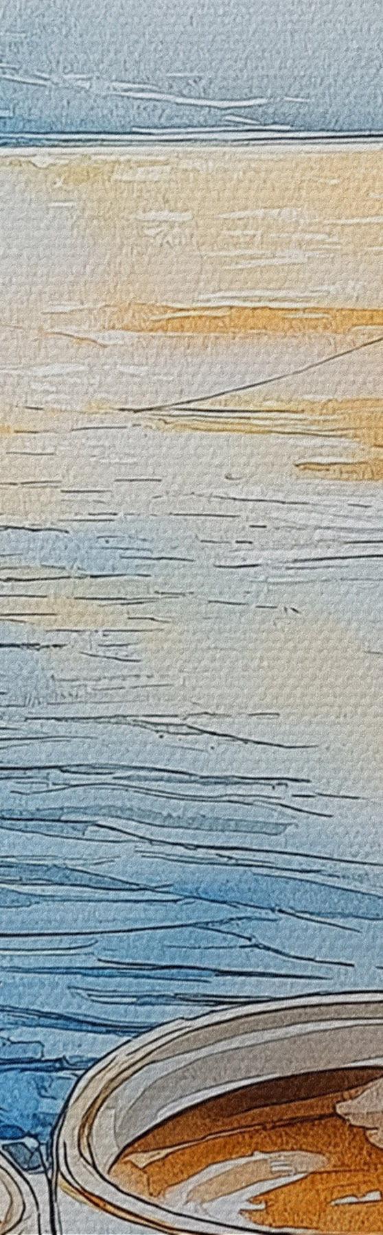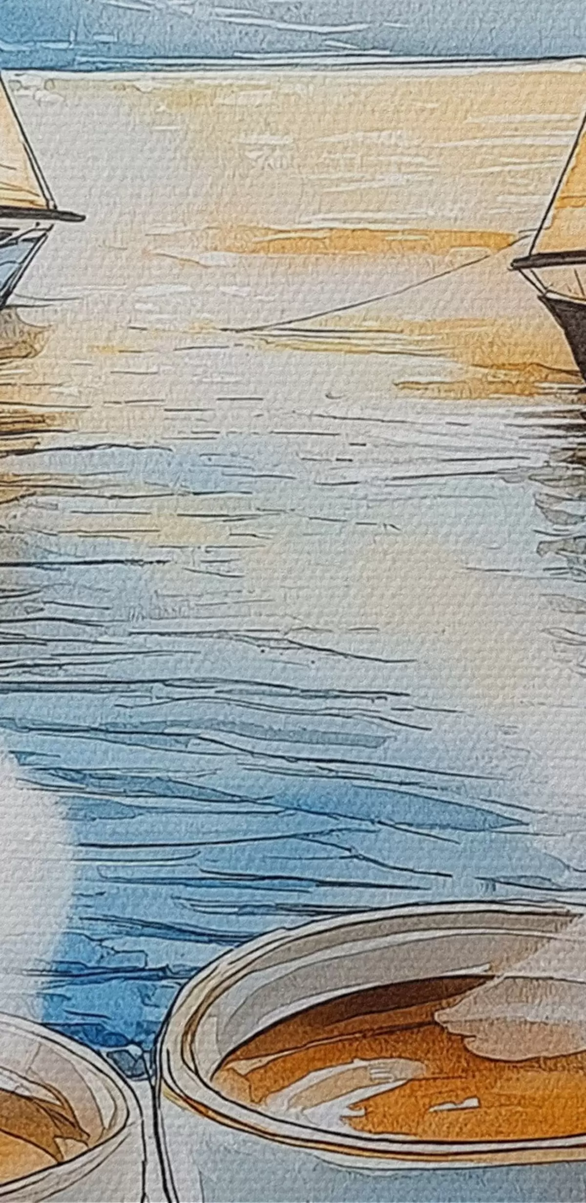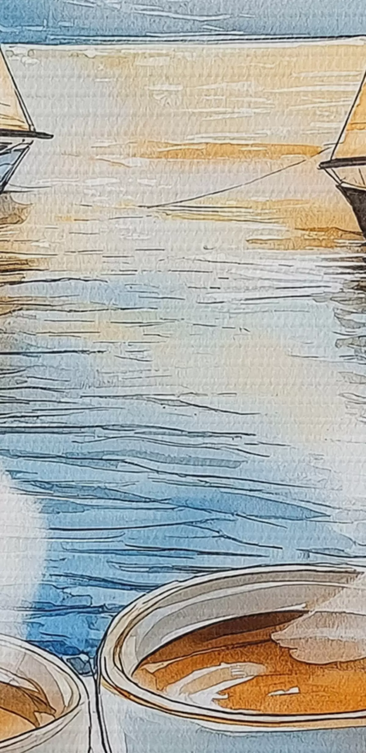 Kép Naplemente a tavon, vitorlások, kávéscsészék, akvarell stílusban Nr r42442