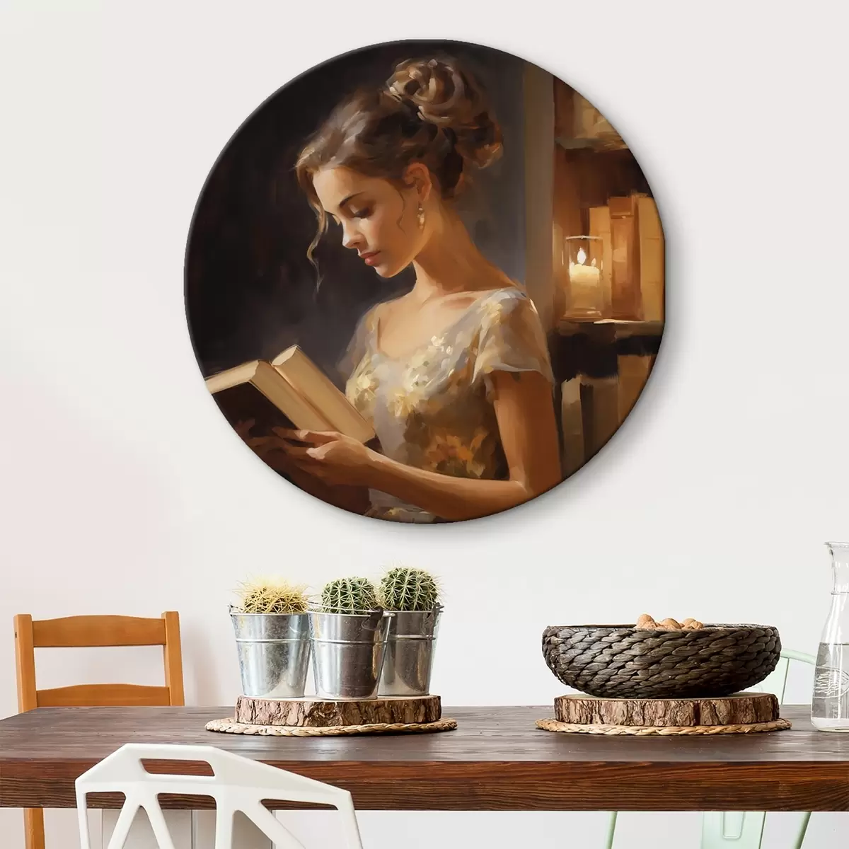 Kép Egy elegáns ruhás fiatal nő könyvet olvas hangulatos megvilágításban, könyvespolcokkal és gyertyák lágy fényével körülvéve Nr r42570