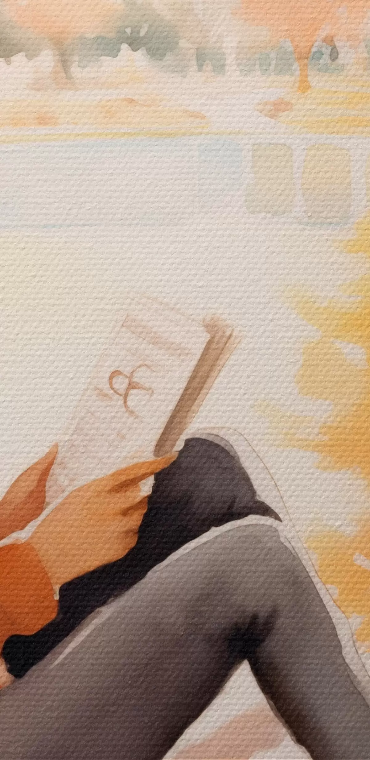 Kép Egy lány könyvet olvas egy nyitott ablak mellett őszi környezetben, háttérben ragyogó fákkal és egy csésze teával a közelében. Nr r42572