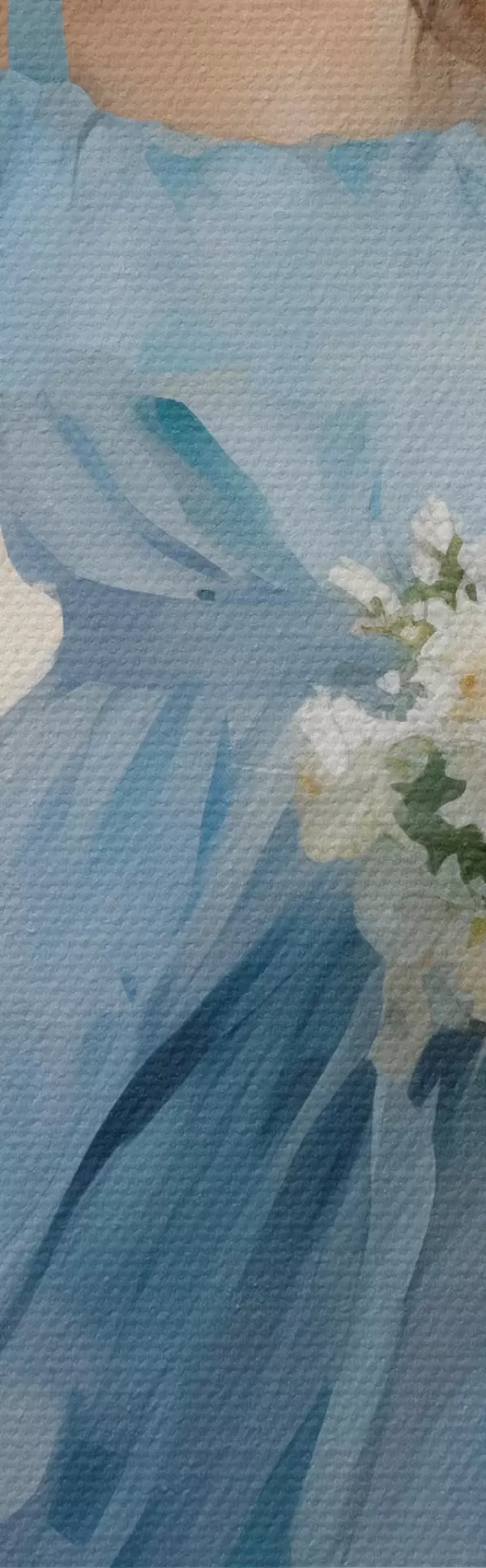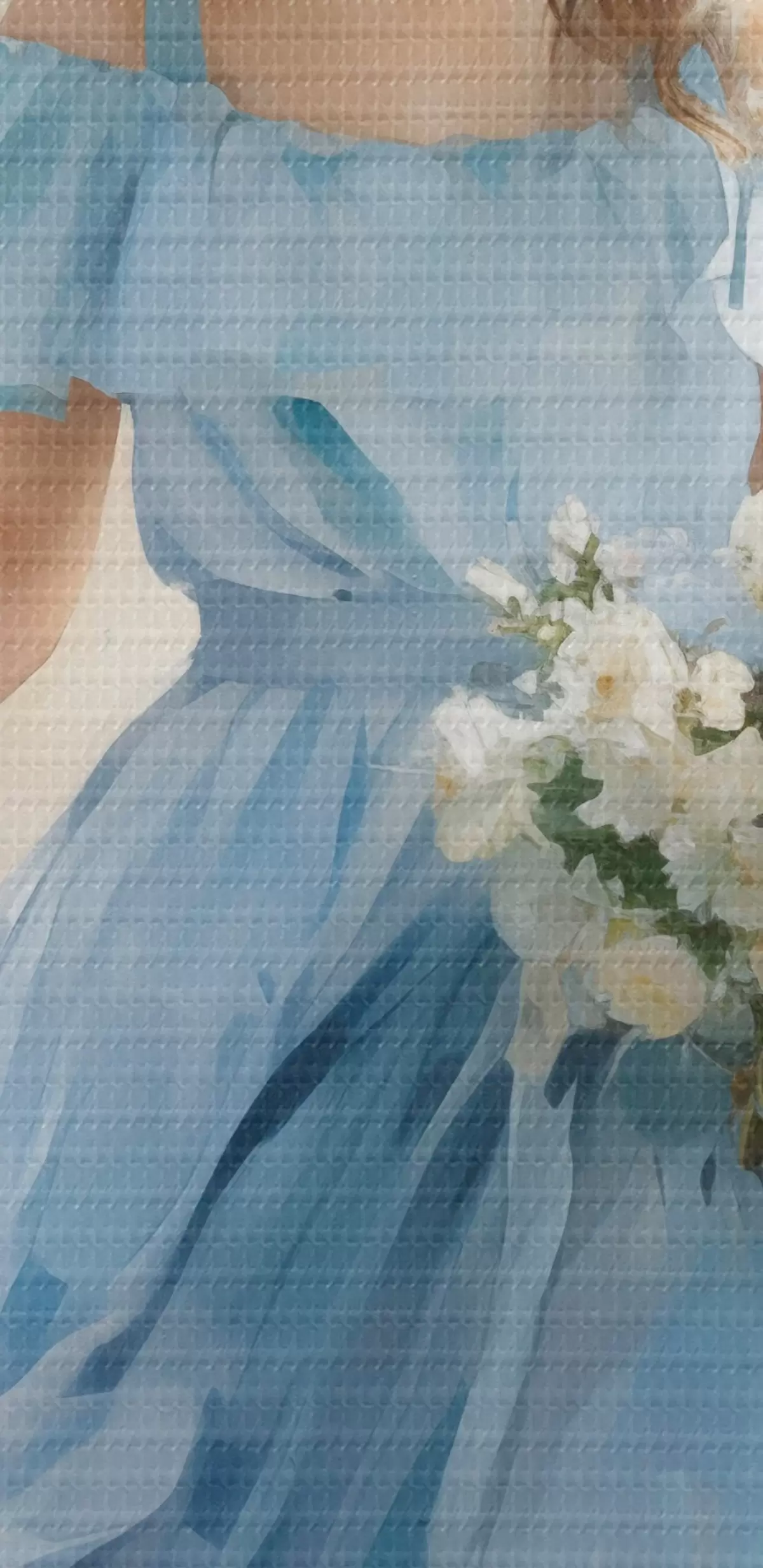 Kép Elegáns lány világoskék ruhában és kalapban sétál a városban, kezében egy csokor virággal, könnyed és romantikus hangulatban Nr r42580