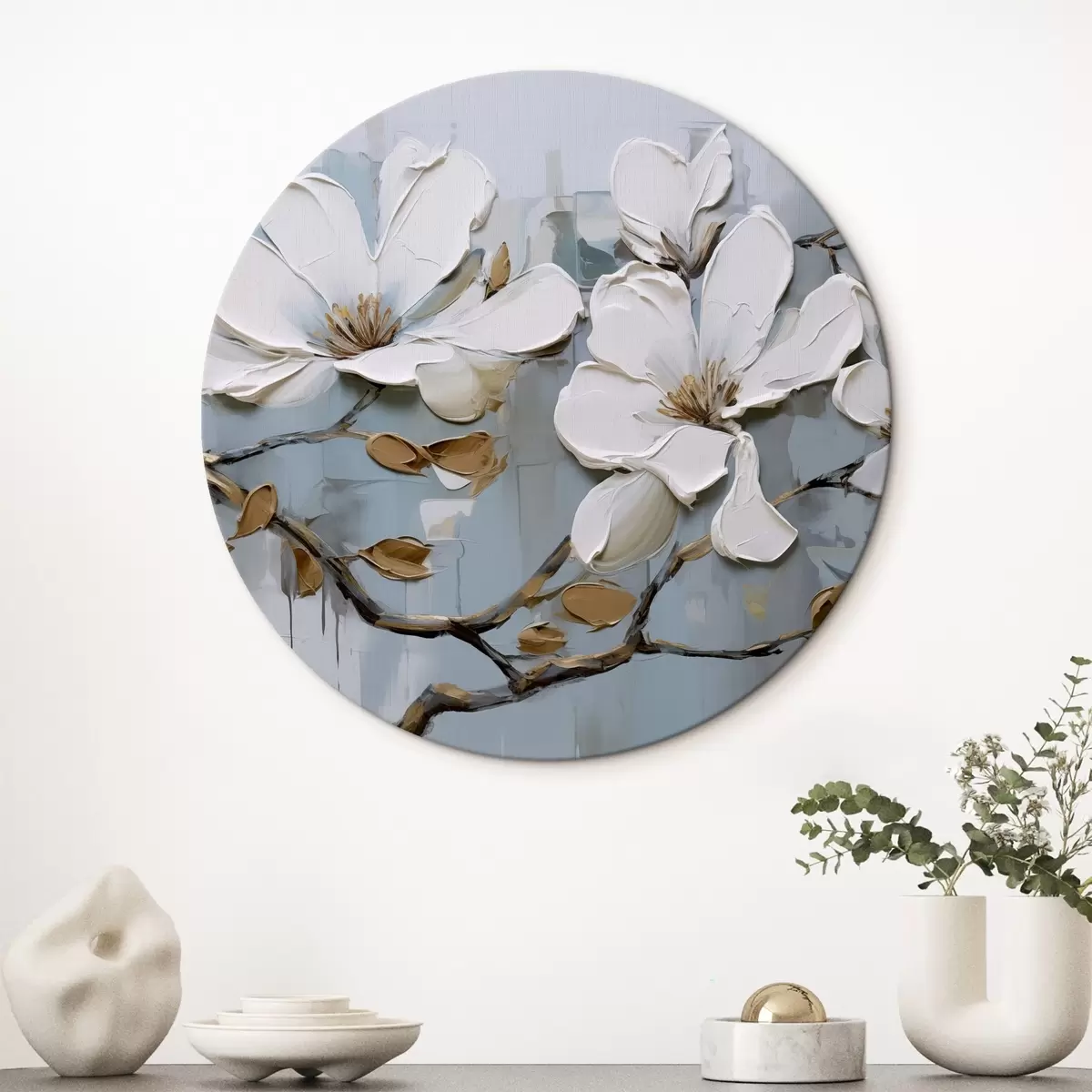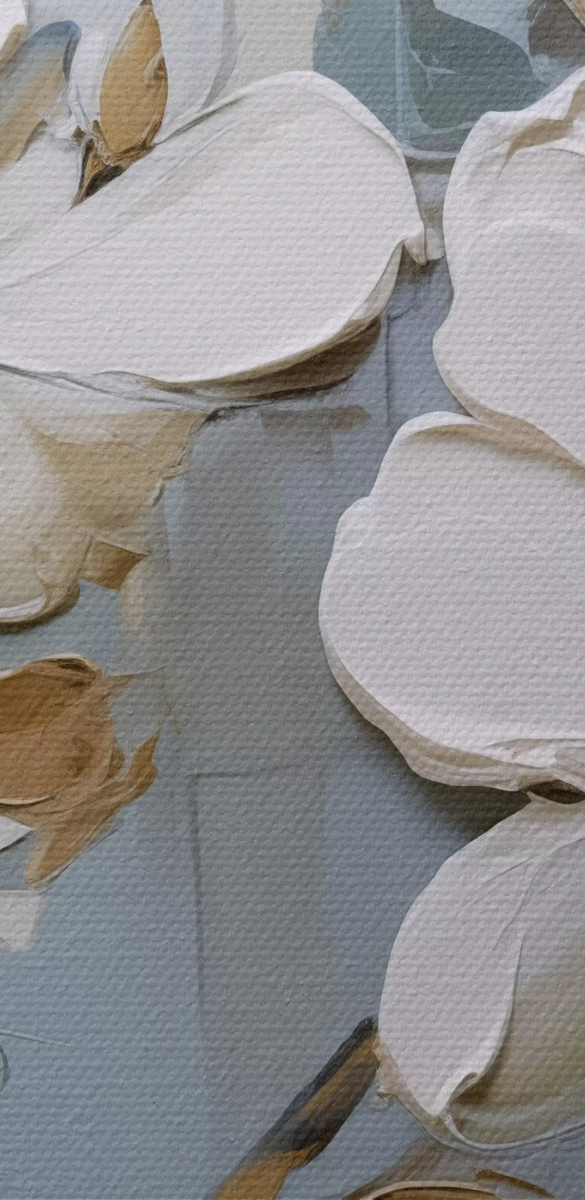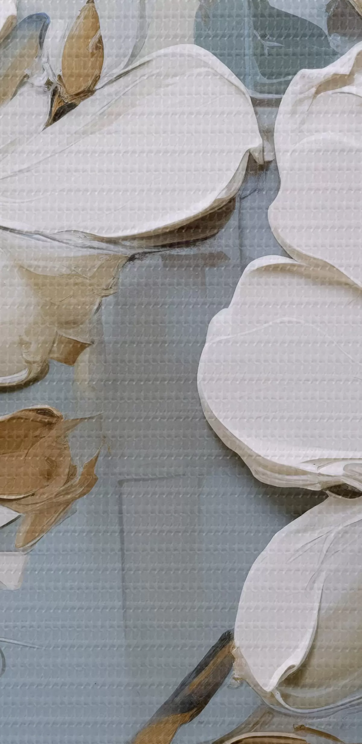 Kép Fehér magnólia virágok texturált szirmokkal és barna levelekkel lágy kék háttéren olajfestmény utánzat Nr r42711