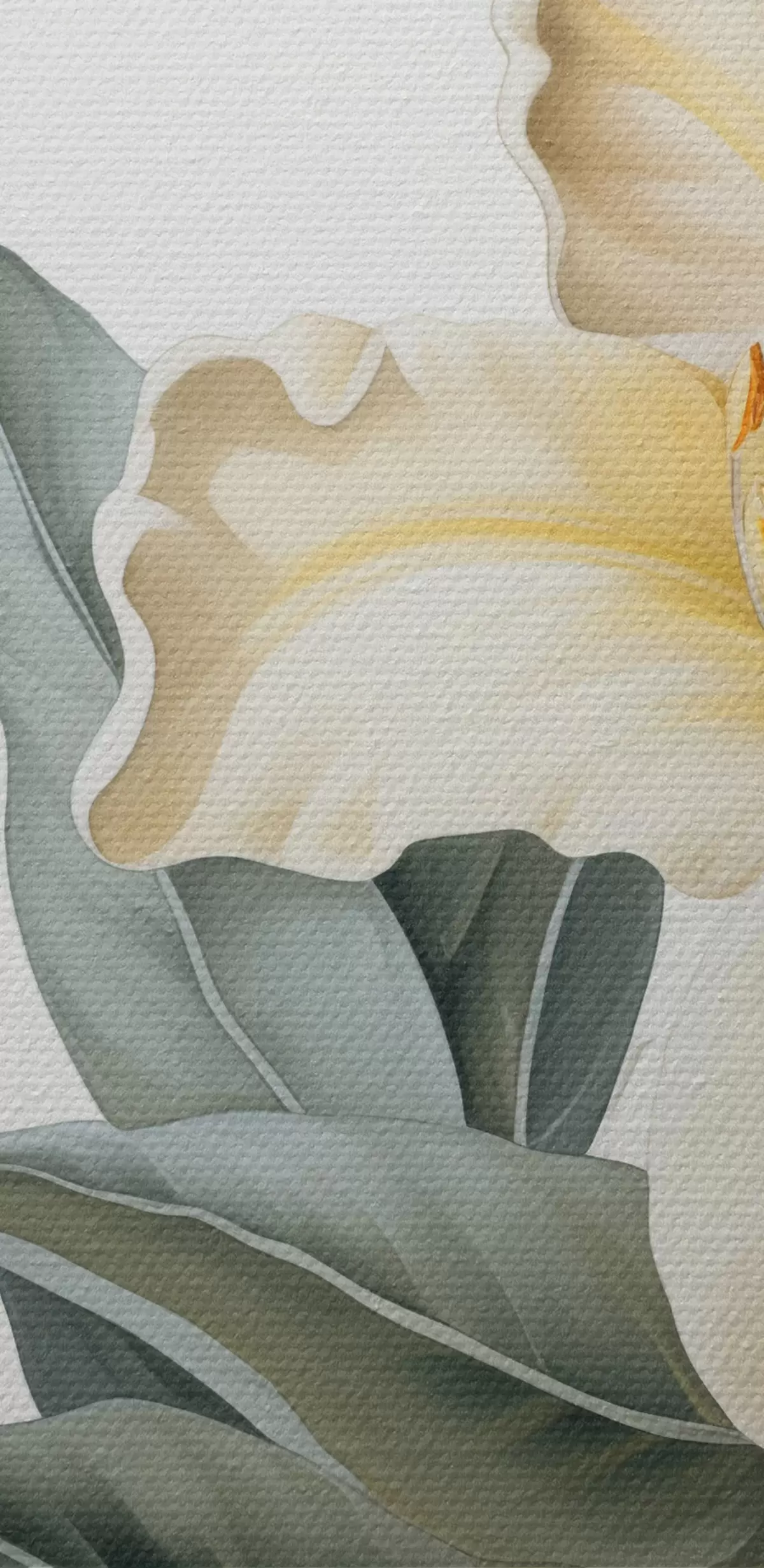 Kép Botanikai illusztráció fehér és halványsárga virágokkal, bonyolult szirmokkal, zöld levelekkel körülvéve Nr r42712