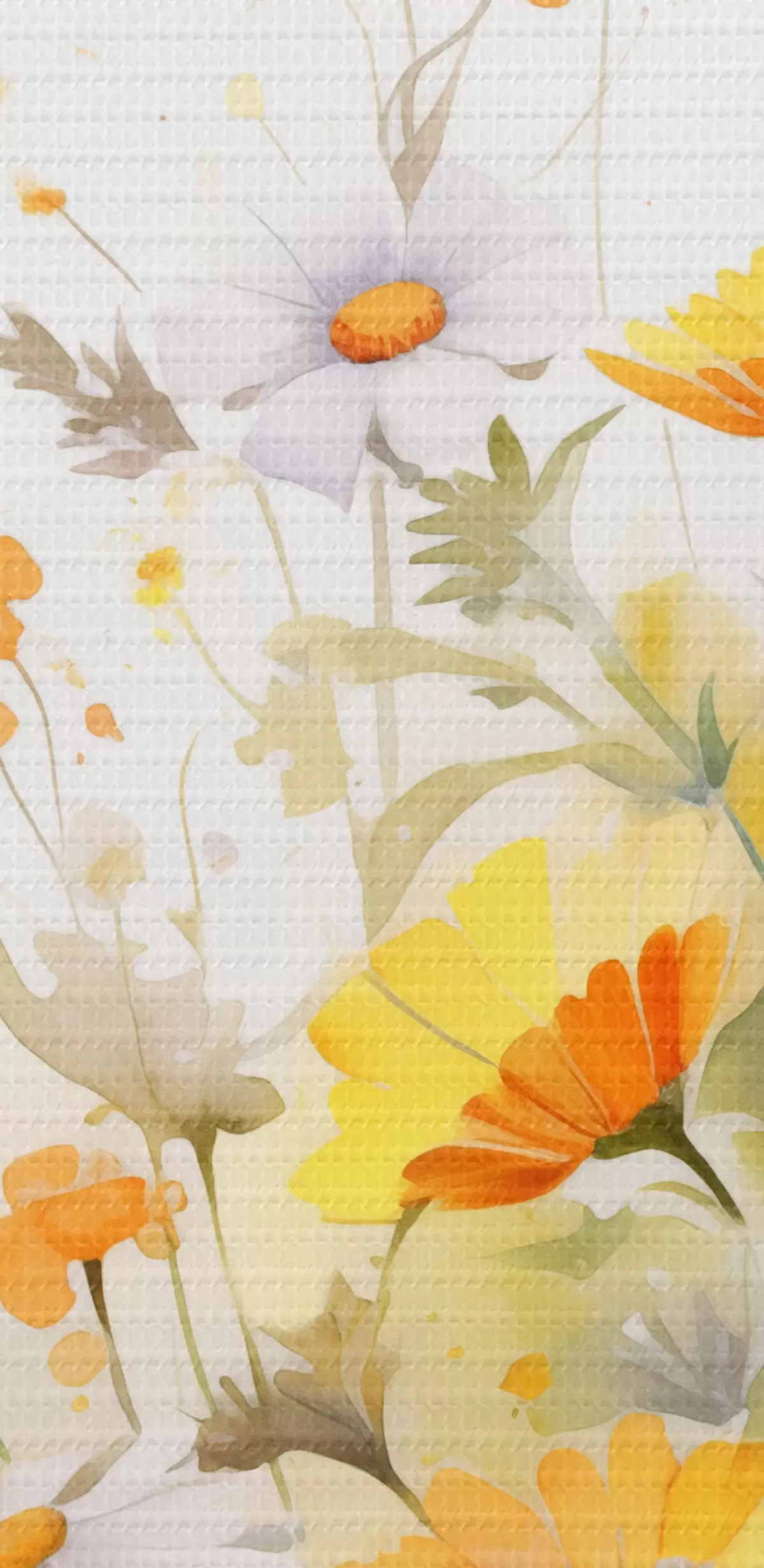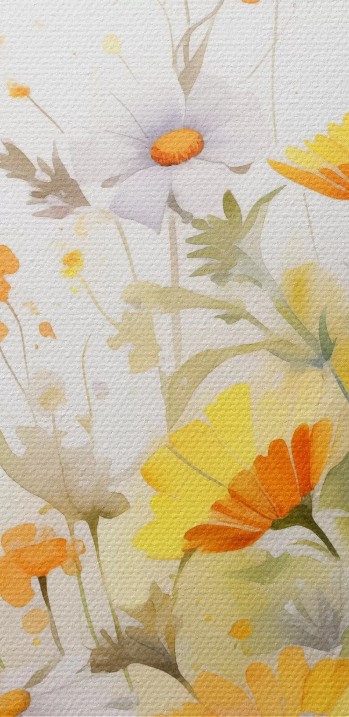 Kép Élénk, akvarellszerű virágmező narancssárga és fehér margarétákkal, a közelben egy pillangó repked Nr r42714