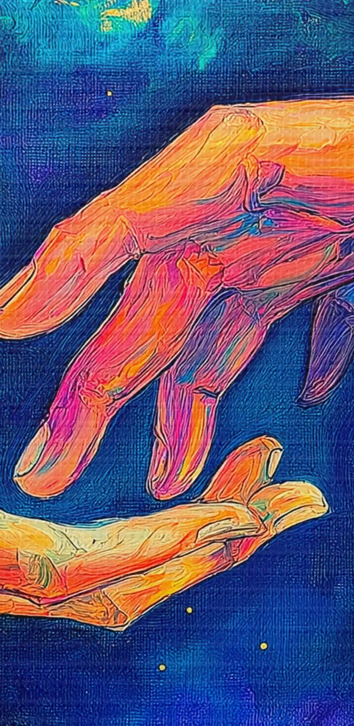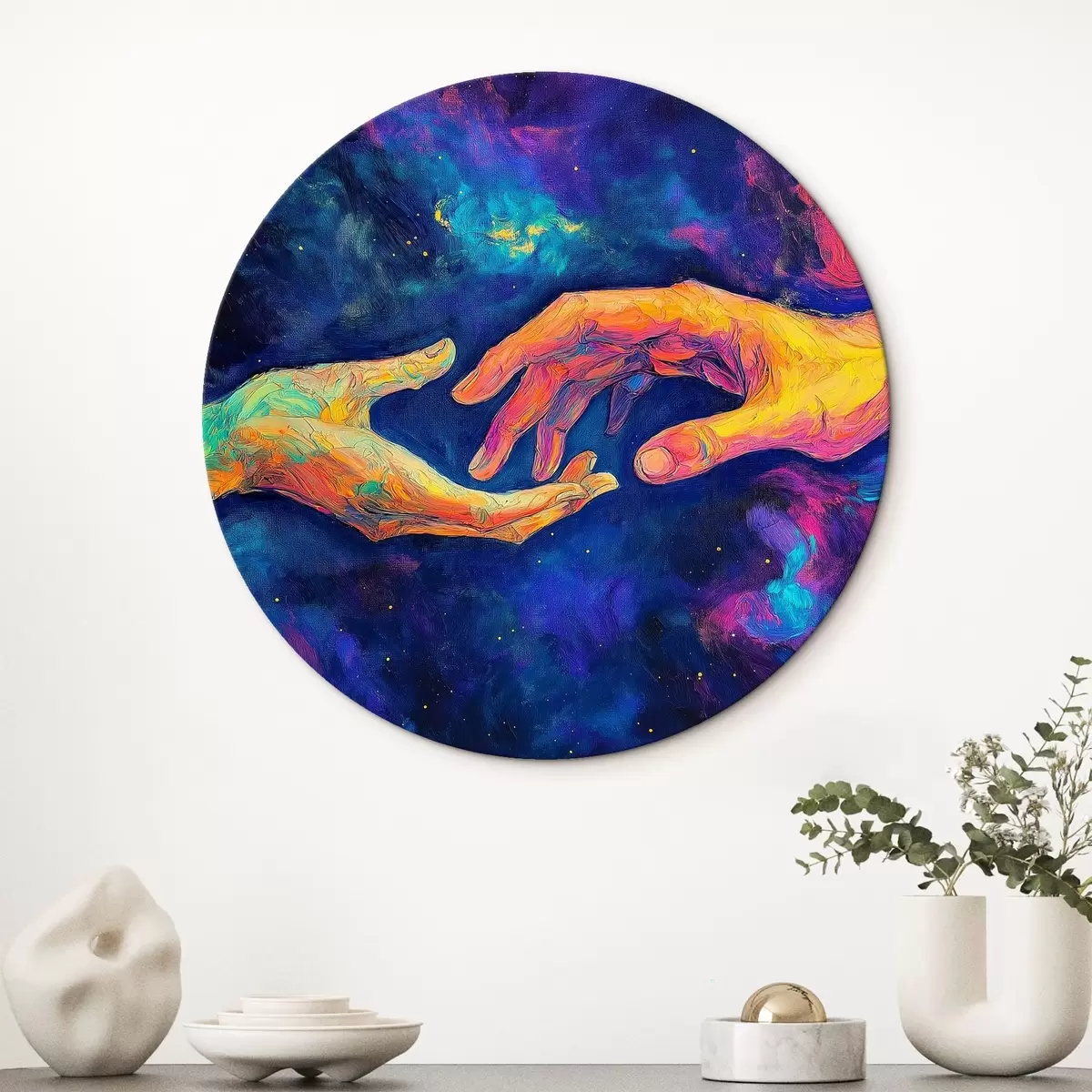 Kép Absztrakt kompozíció két kéz egymás után nyúl, vibráló színpalettán, kozmikus háttéren Nr r42937