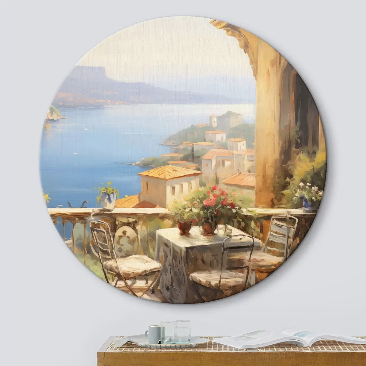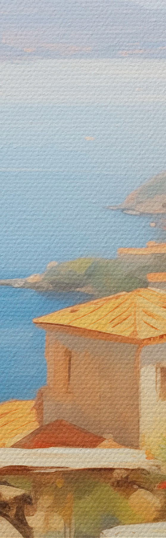 Kép Olajfestmény utánzata erkély virágokkal, kilátással a tengerre, házak a tengerparton, napsütéses nap, kék ég Nr r43173