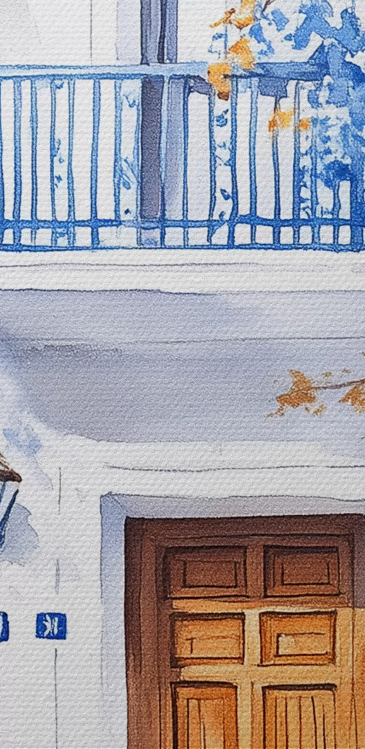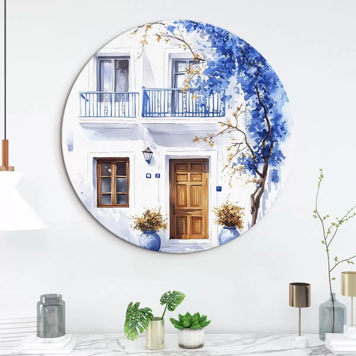 Kép Virágzó fa kék virágokkal, fehér ház, Görögország, akvarell stílusban Nr r43183