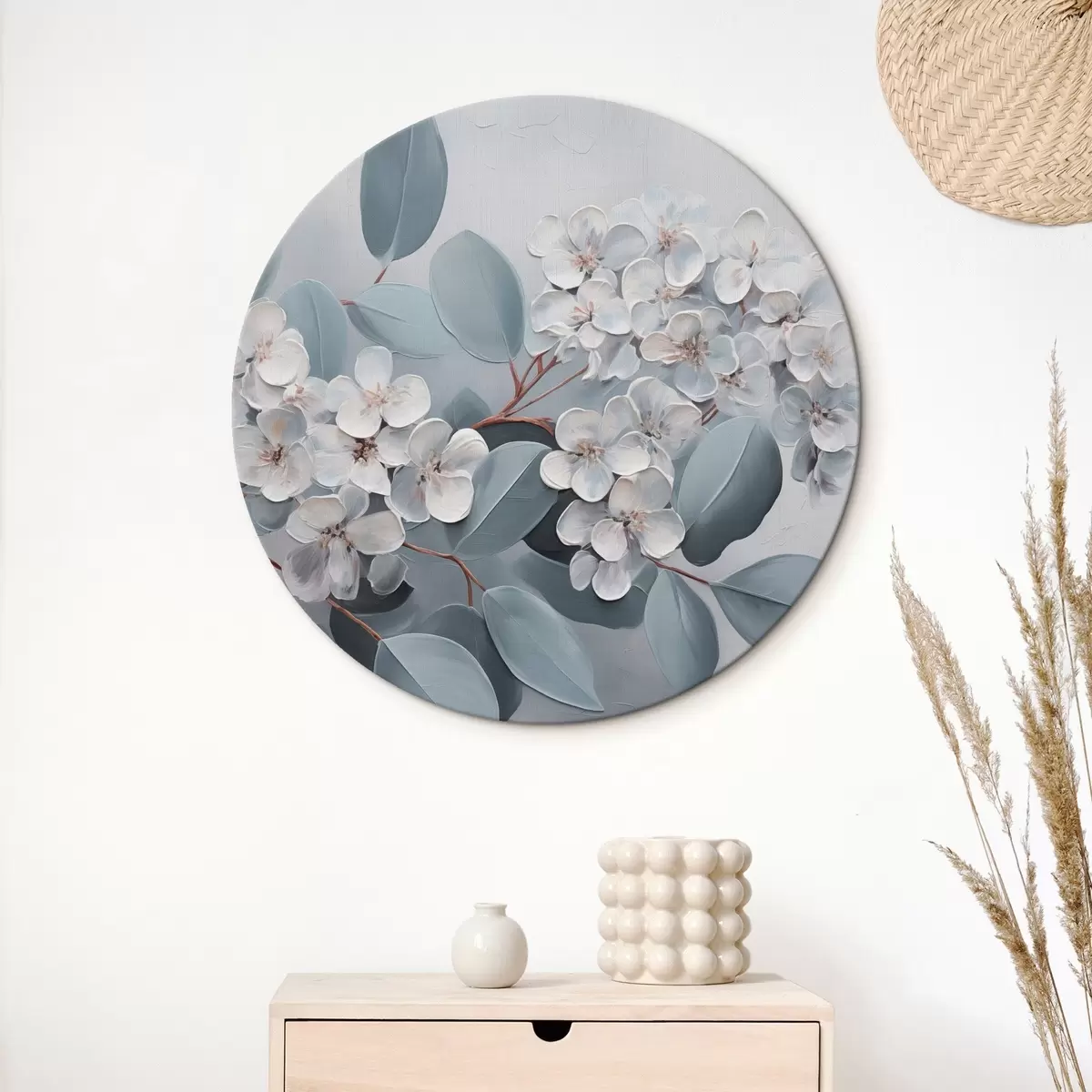 Kép Egy ág fehér hortenzia virágok teljes virágzásban, kék levelekkel, világosszürke háttéren, olajfestmény stílusban Nr r43391