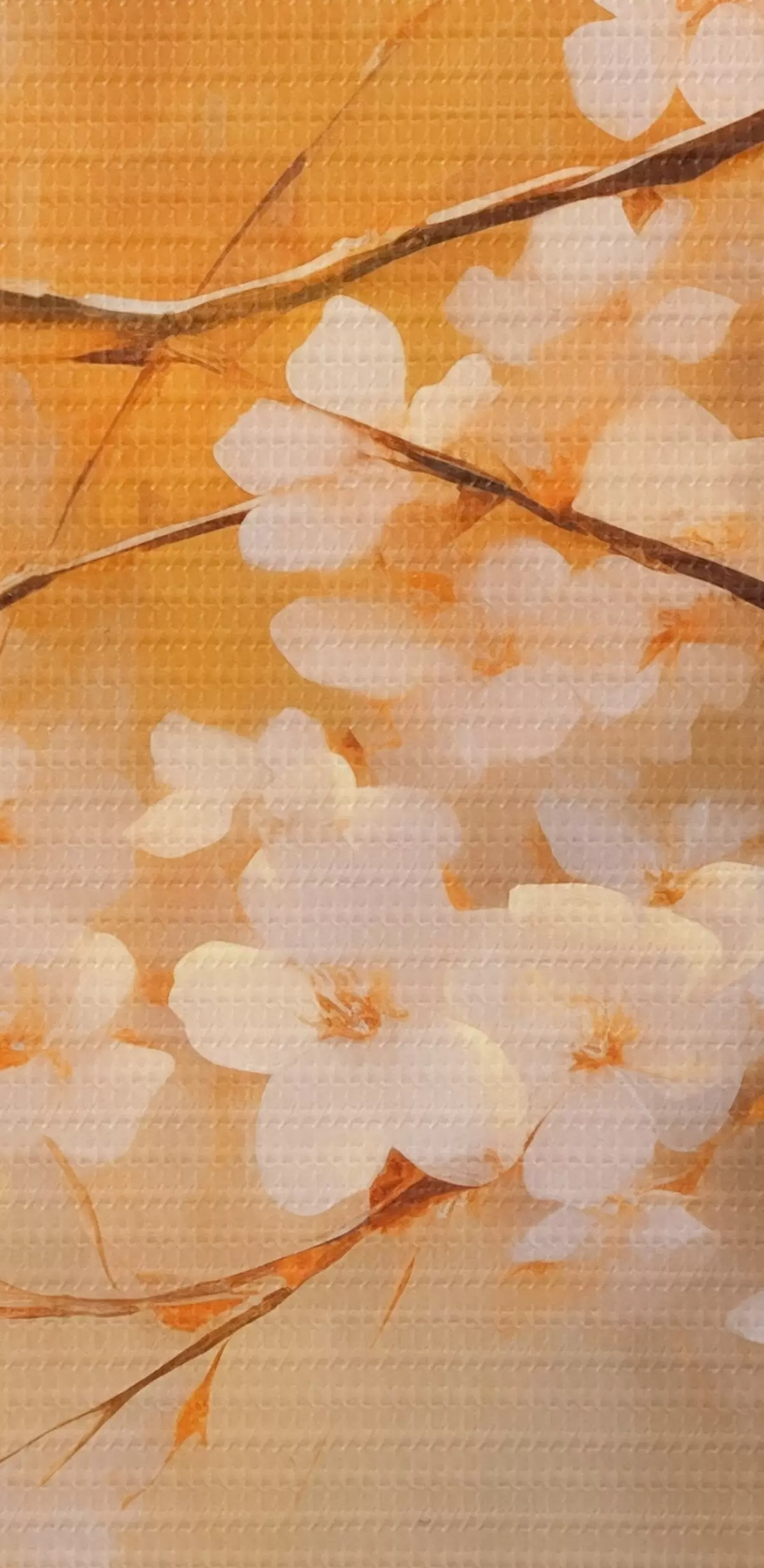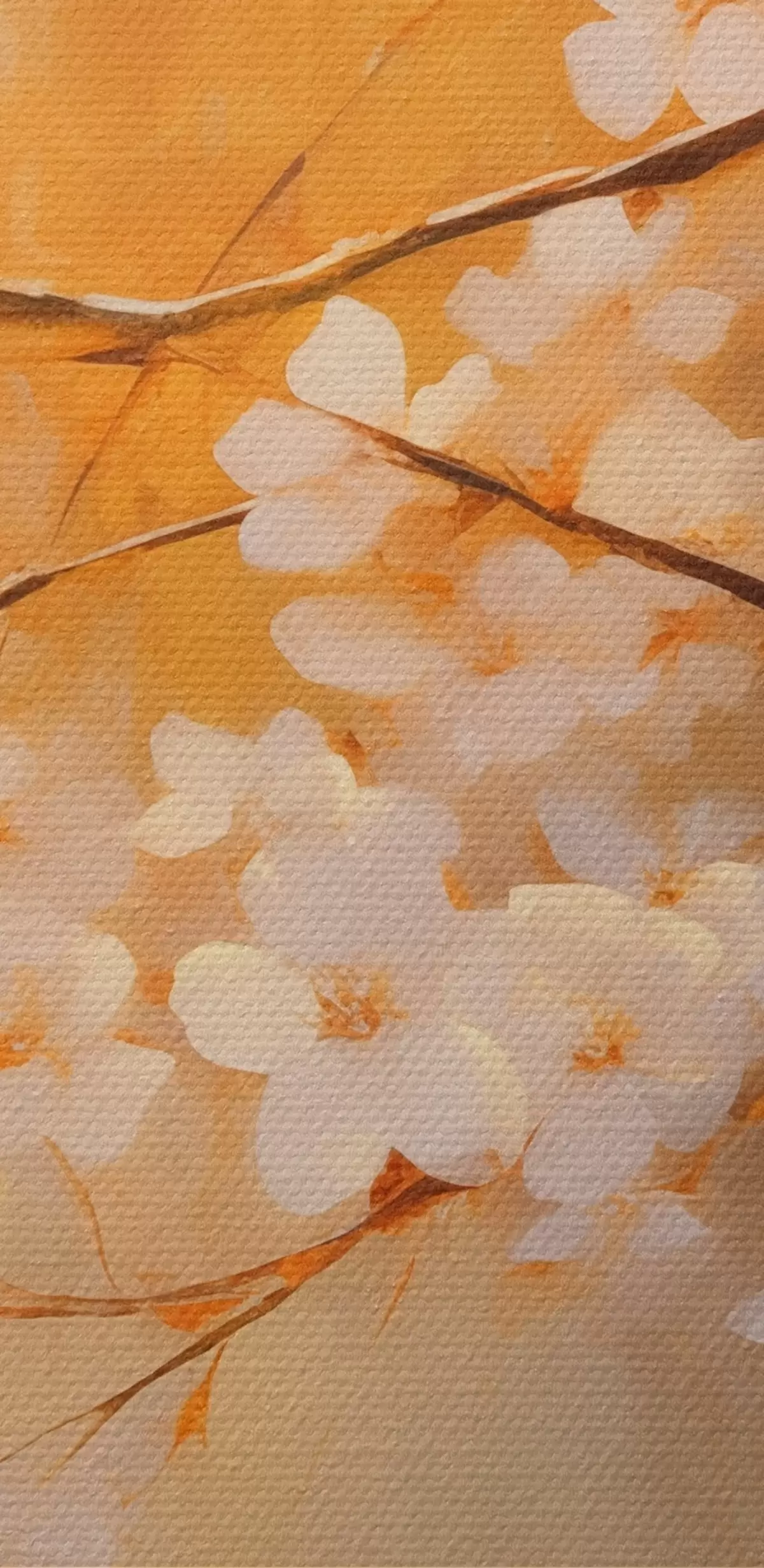 Kép Cseresznyevirág ágak narancssárga virágokkal, meleg színpaletta, sárga árnyalatú elmosódott háttér előtt Nr r43407