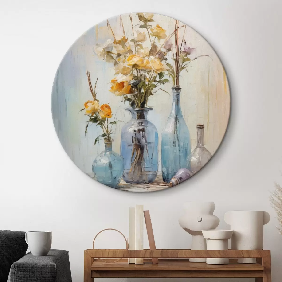Kép Sárga rózsák csendélete kék üvegvázában, könnyű textúrájú háttér, lágy ecsetvonások, olajfestmény stílusban Nr r43409