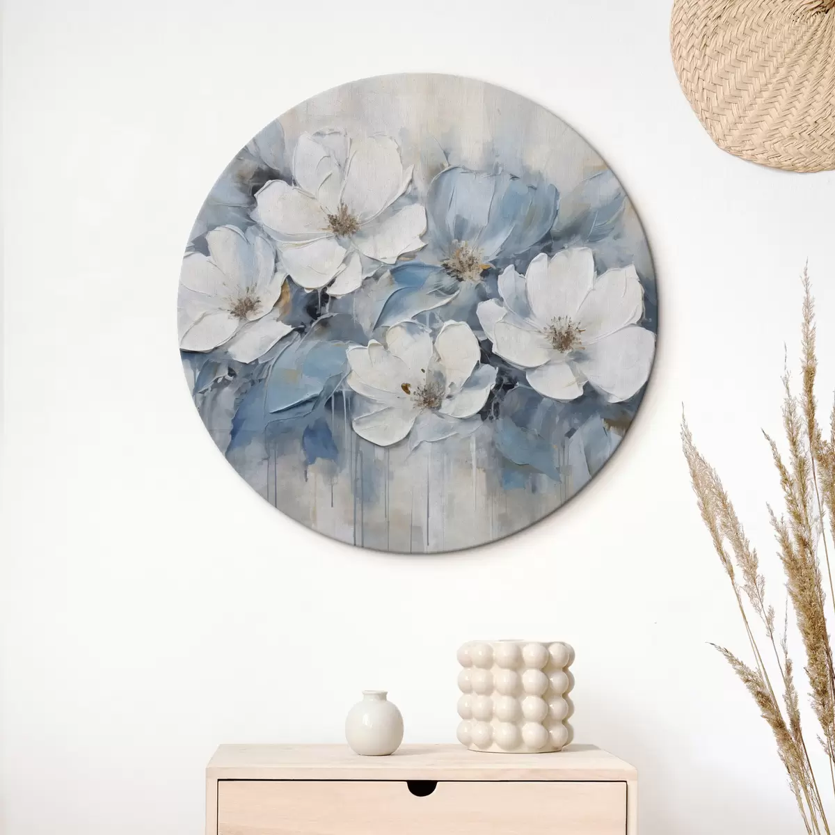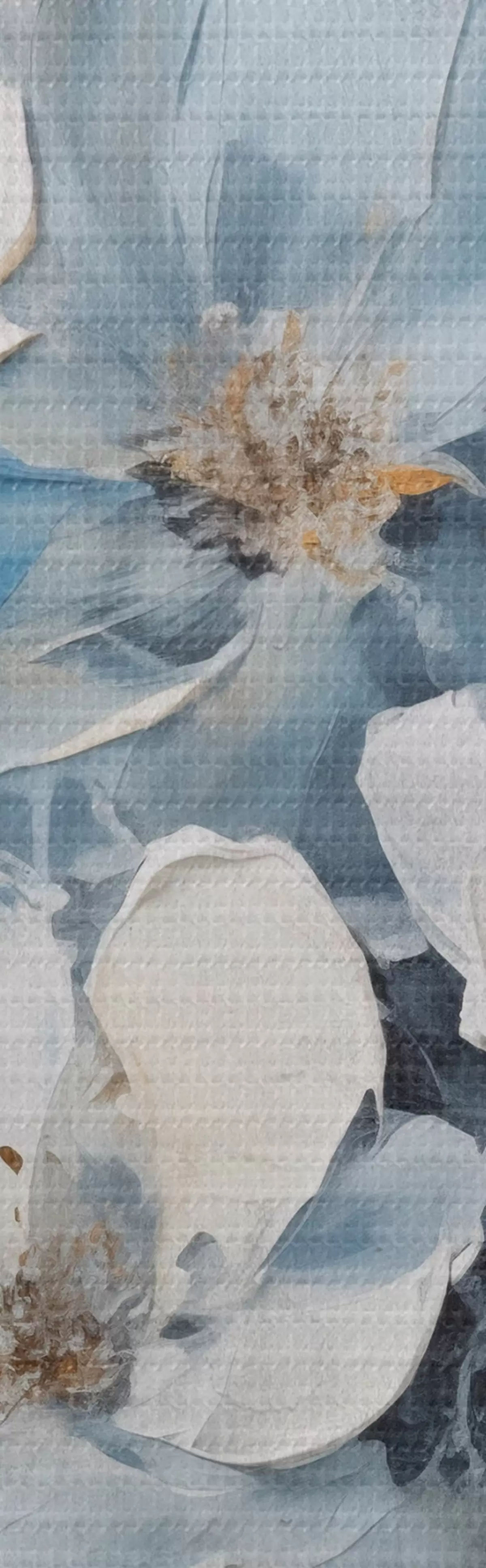 Kép Fehér virágok kék levelekkel, világos bézs háttéren, látható ecsetvonásokkal Nr r44395