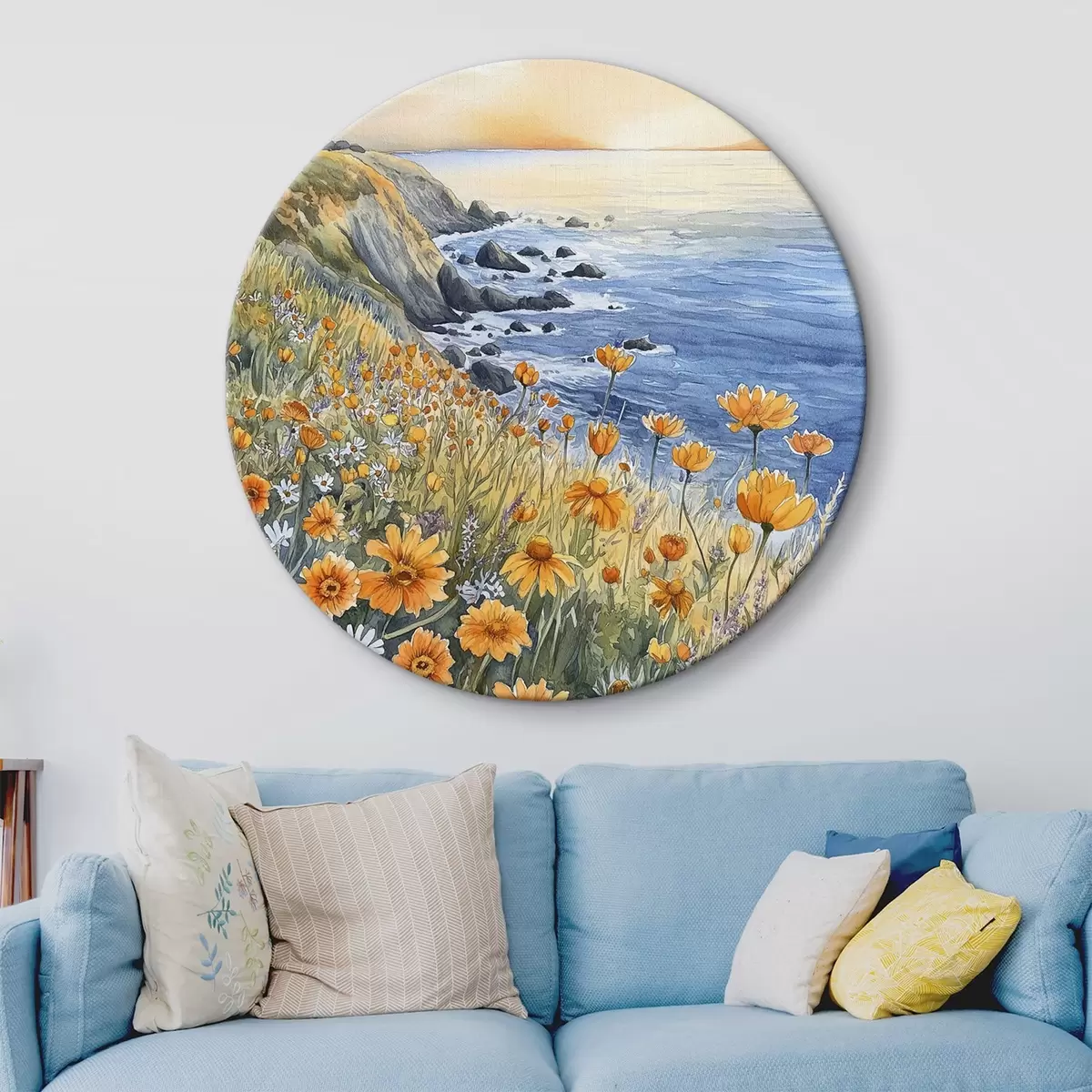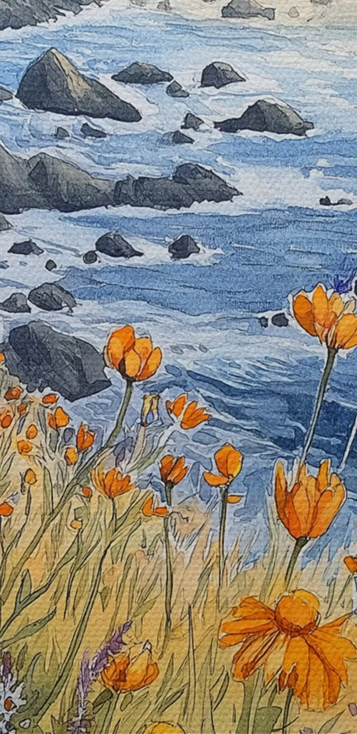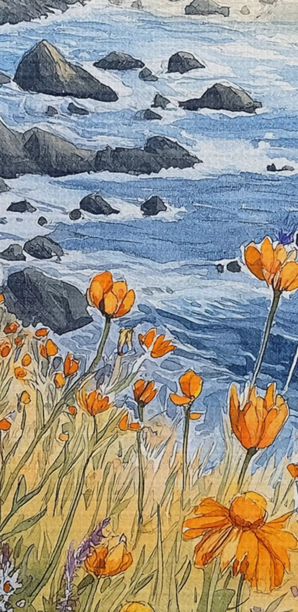 Kép Szikla narancssárga virágokkal, óceánpart, Portugália, akvarell stílusban Nr r44604