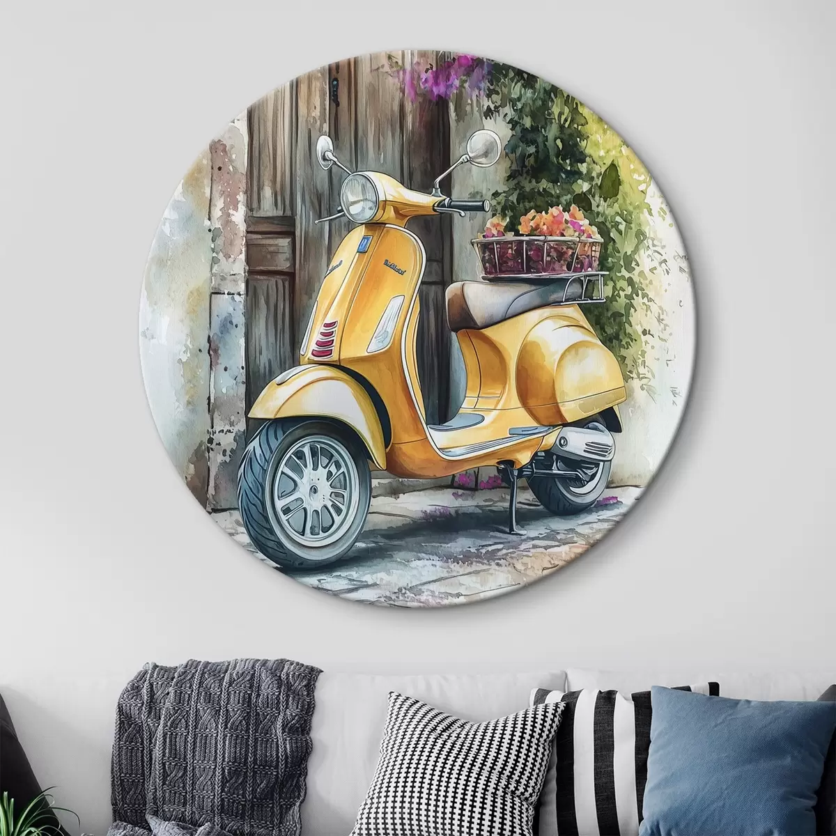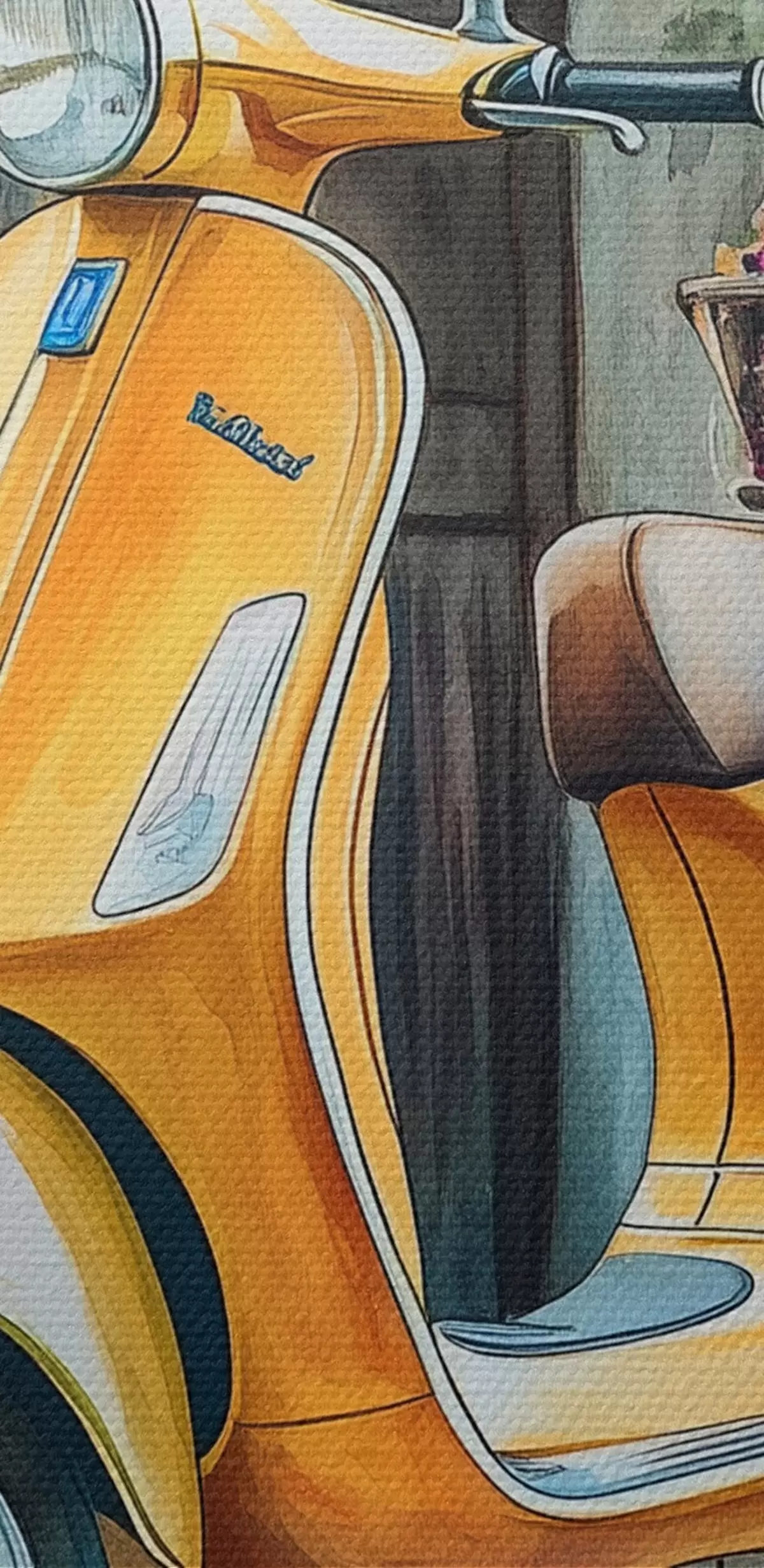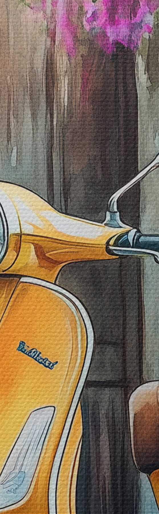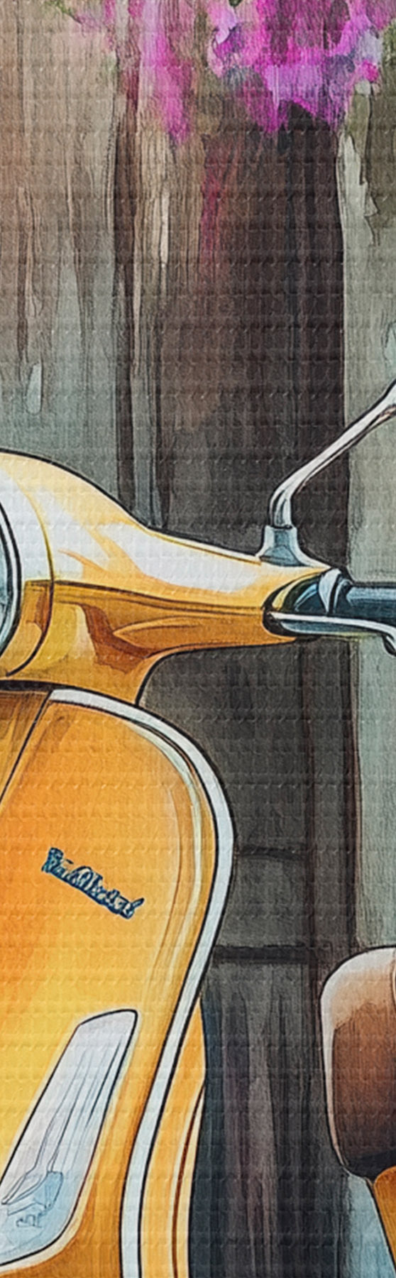 Kép Sárga Vespa robogó fából készült ajtó mellett virágokkal Nr r44607
