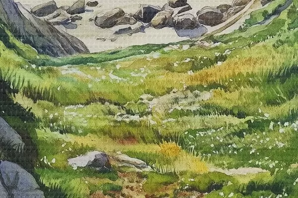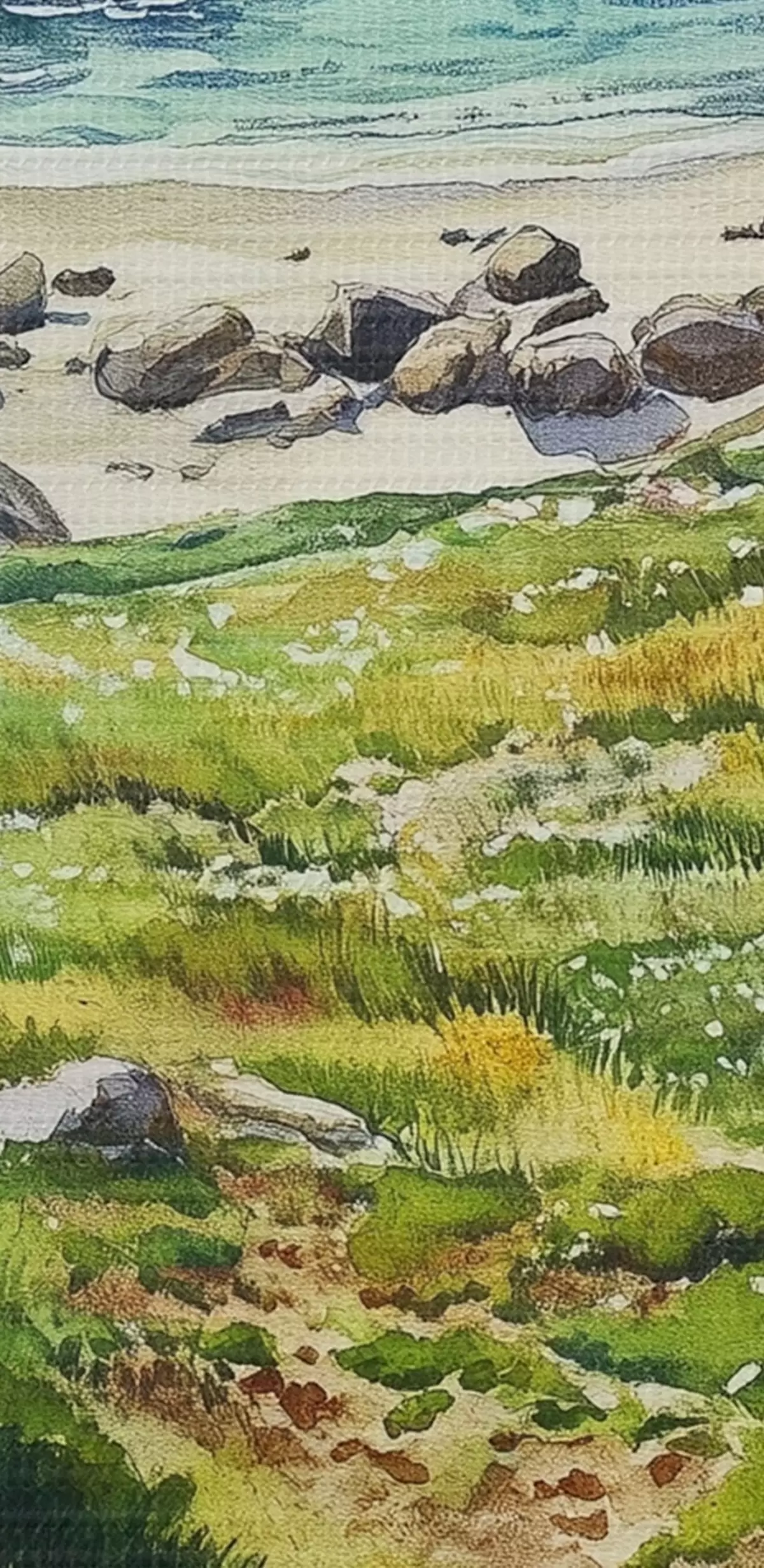 Kép Tengerpart sziklákkal és zöld fűvel, akvarell stílusban, nyár Nr r44616